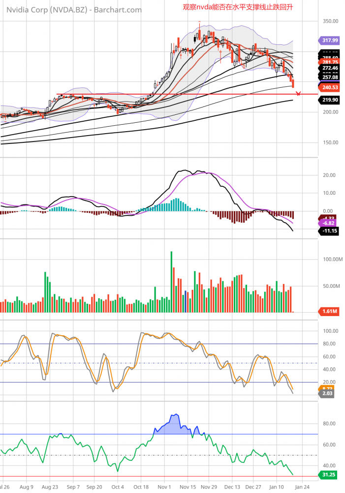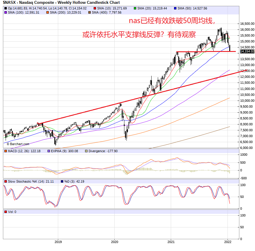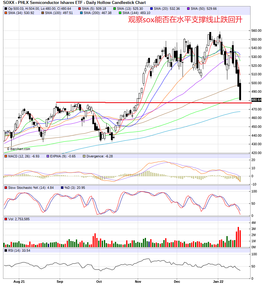 周三的贴子预测,今天大盘有可能反弹(见1月19日贴)。果然,今天大盘高开,科技股和工业股同时反弹。到上午11点,指数上涨到最高点,大盘涨福1.5%,qqq涨幅2.0%。此后指数从顶点缓慢下跌,到下午3点,跌穿零线后,加快下跌。到收盘,大盘跌1.1%,nas和qqq跌1.3%。和昨天同样,今天半导体继续弱势,跌3.1%,nvda跌3.7%,amd跌5%,amat跌2.7%。amzn跌3%,aapl跌1%,msft跌0.6%,googl跌1.3%,tsla平收,涨0.06%。dow跌1.0%,xli跌1.3%,xlf跌0.6%,iwm跌1.8%。