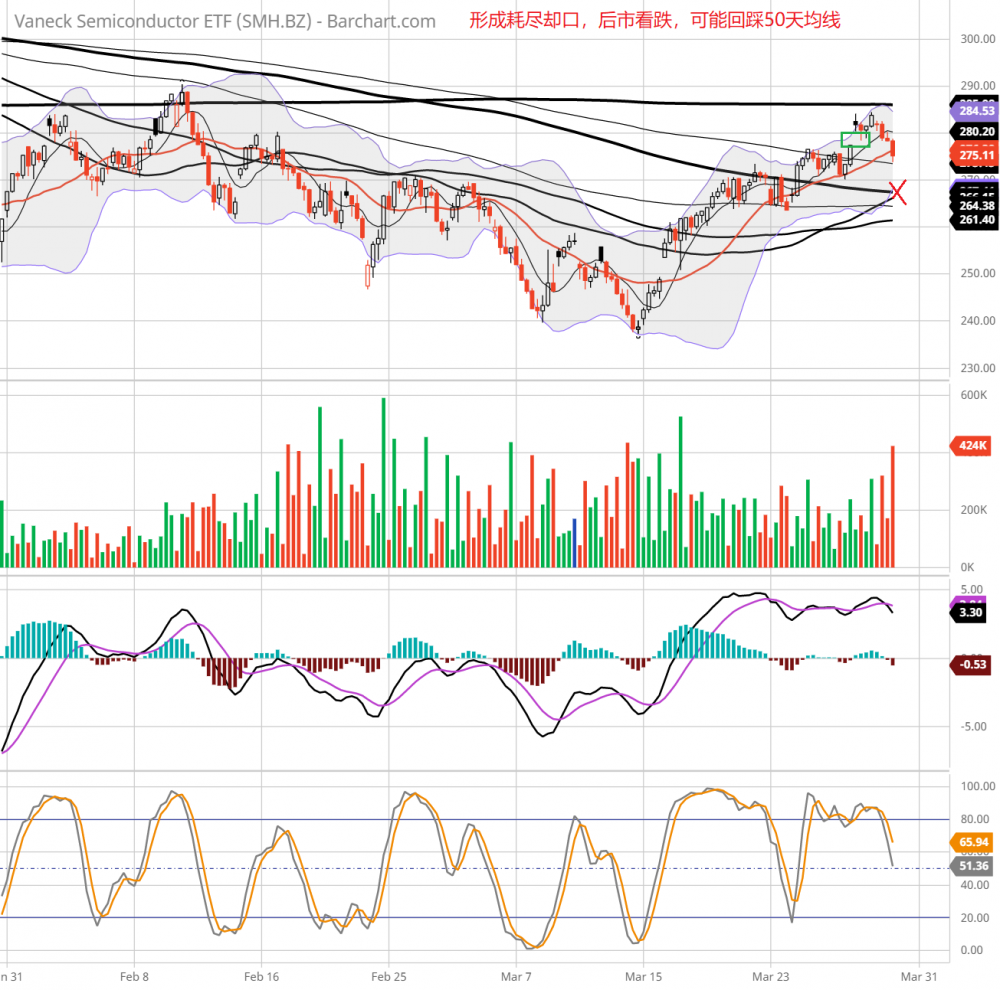 TA观察,spx昨天的缺口仍然开放,收盘前30分钟内反弹0.4%(见图),暗示多头仍然坚持,明天是否反弹,有待观察。qqq走势和大盘类似,大盘和qqq明天的走势难判断。soxx今天跌2.9%,昨天的缺口变成耗尽缺口,强烈暗示后市看跌。明天大盘和qqq走势取决于soxx的走势。我个人看法,大盘下跌的概率大。