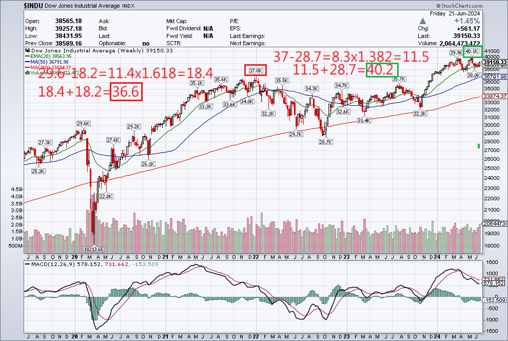 网友旅行者谈到 神秘的数字911,dow和nas发生911共振等等不可思议的现象。起实他观察到的几个现象,归结起来就是当dow和nas指数从回调的大底反弹越过前期历史高点后,继续上涨时是否还有阻力点处在。我想到Fibnacci数列是否能回答这个问题,用dow最近二次从大底反弹的数据做实验,令人惊奇的发现,Fib数列能够非常合理化的模拟已有的走势数据(见图)。例如dow由20年3月的大顶29.6k回落到大底18.2k。采用Fib数1.618,就计算出可能一个阻力点是36.6k,dow在21年12月时的大顶是37.0k,二者误差1%。再用37k和22年8月的大底28.7k,采用Fib数1.382,就能计算出dow反弹越过37k后的可能阻力点在40.2k,dow在今年5月的实际高点是40.1k,二者误差0.2%!注意,不是每一个用Fib数列计算点位真的表现出强阻力,在实际的操作中,遇到用Fib数列1.382,1.618预测出的阻力位时操做要谨慎一点就好。