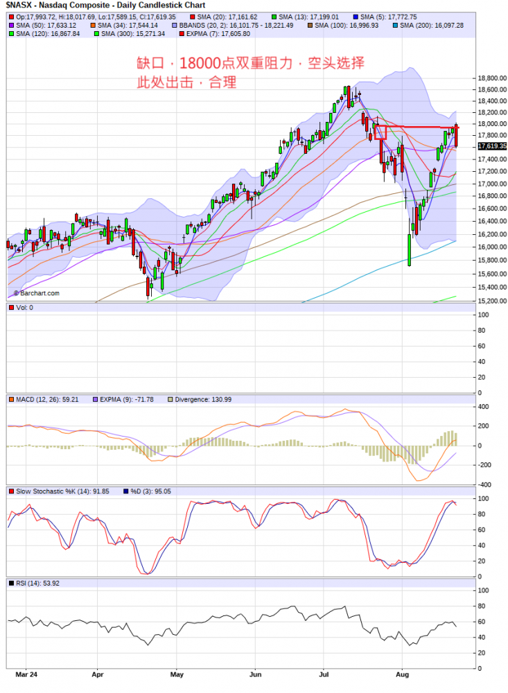 看盘印象,周四盘前没有重要的财经消息,大盘延续周三的惯性小幅高开,随即遭到空头清理杀跌,直到收盘,spx跌0.9%,nas跌1.7%。观察走势图发现,当下nas面临·大整数18000点的隐形阻力(见图),smh面临50天均线阻力(见图)。空头选择这二个关键点位阻击多头,合理。周四收盘,nas,qqq仍然站在50天均线上方,没有破坏中期的上升趋势。因此是否可以说,美股周四大跌属于技术性调整,和基本面无关。重点观注,nas在后续走势中能否守住50天均线。个人操作,继续持股。