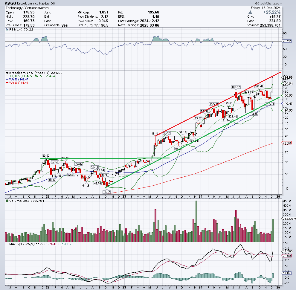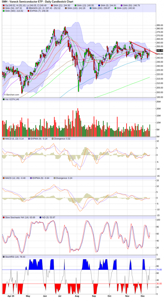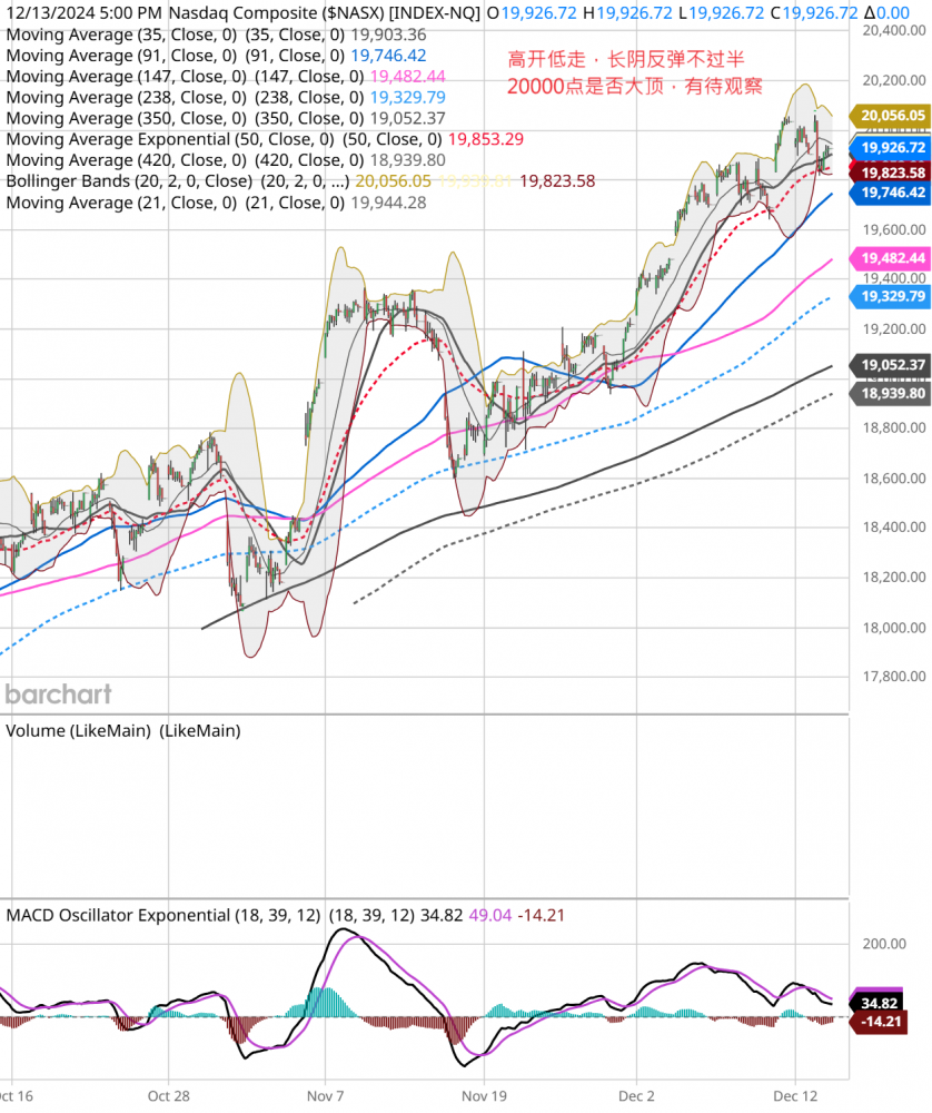 周五大盘小幅高开后震荡走低,收盘0.0%, nas涨0.12%。dow跌0.22%,大科技股价走势疲软,msft跌0.5%,aapl涨0.07%,googl跌1.1%,anzn跌0.6%,tsla涨4.3%,soxx涨2。7%,avgo涨24%,tsm涨5%,nvda跌2.2%,amd跌2.2%,amat涨0.2%。