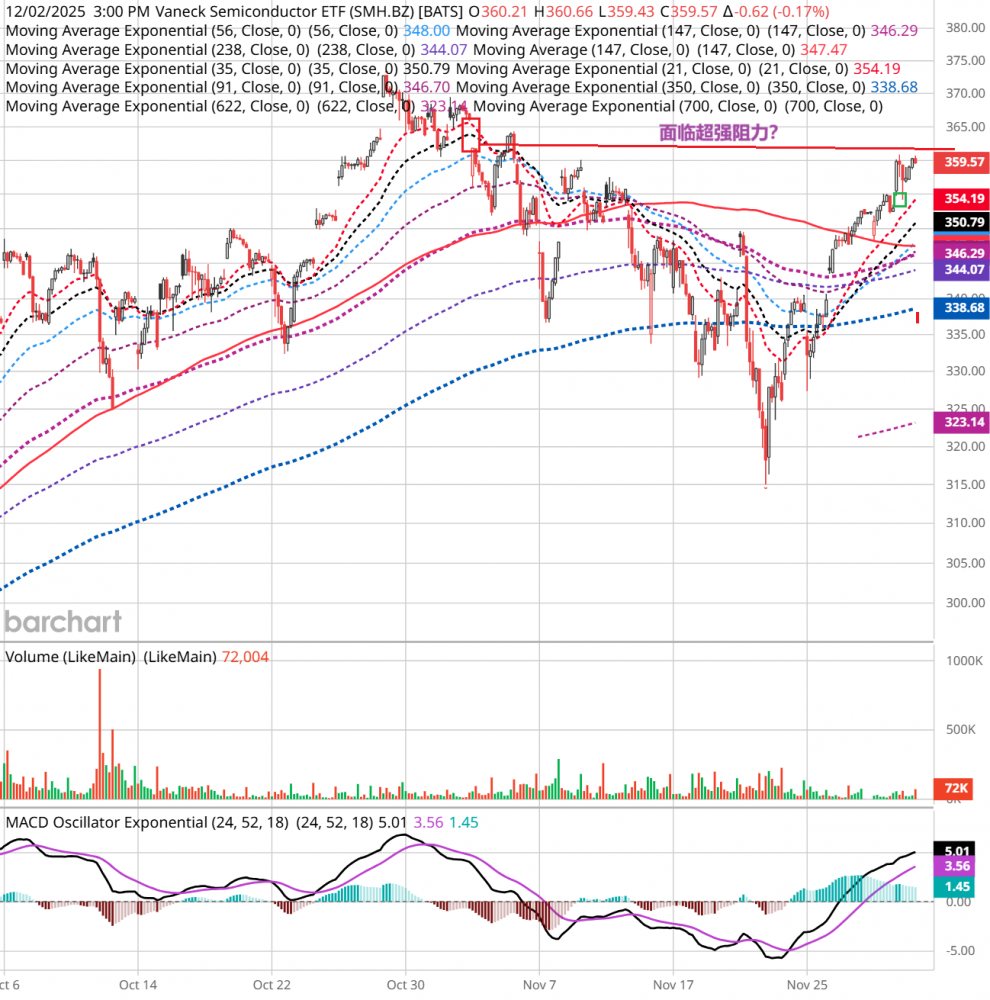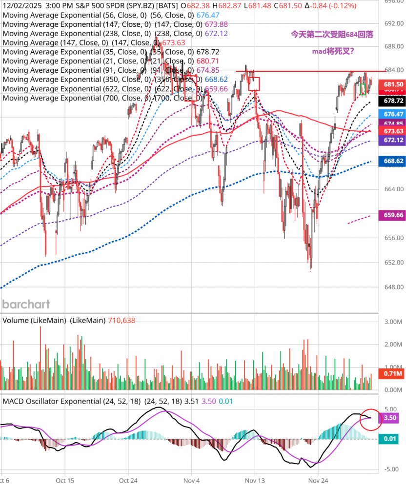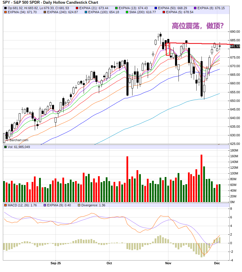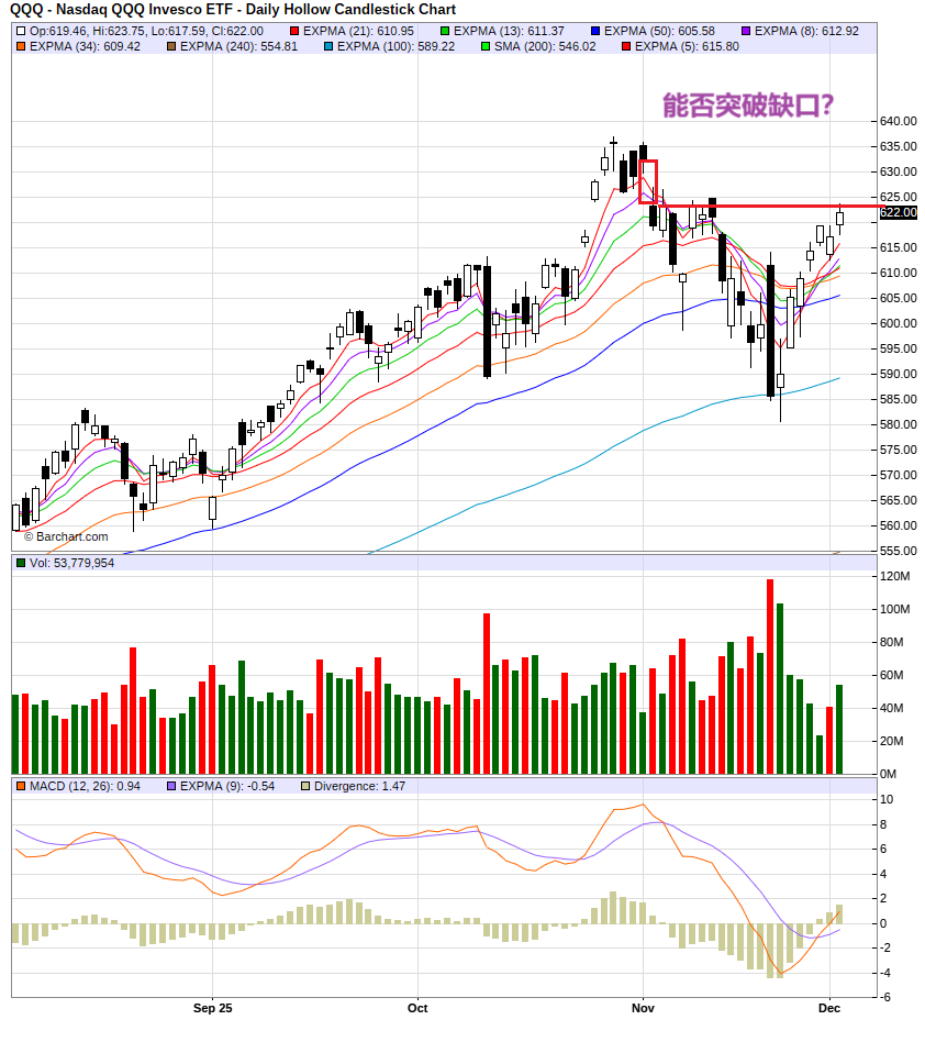 周二大盘高开后震荡,收盘涨0.25,qqq涨0.8%,dow涨0.4%。大盘在阻力区已经震荡3天(见图)。qqq和smh今天补涨,同样已经上涨触及缺口下界(见图)。大盘能否在smh和qqq的推动下突破缺口阻力?有待观察。个人的操作,继续减仓。个人看法,仅供参考。