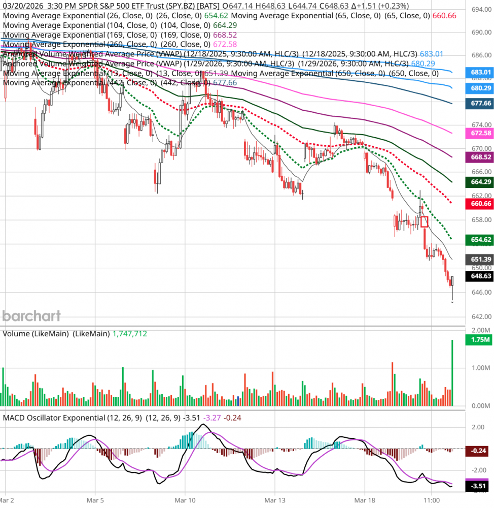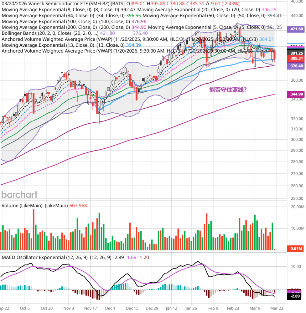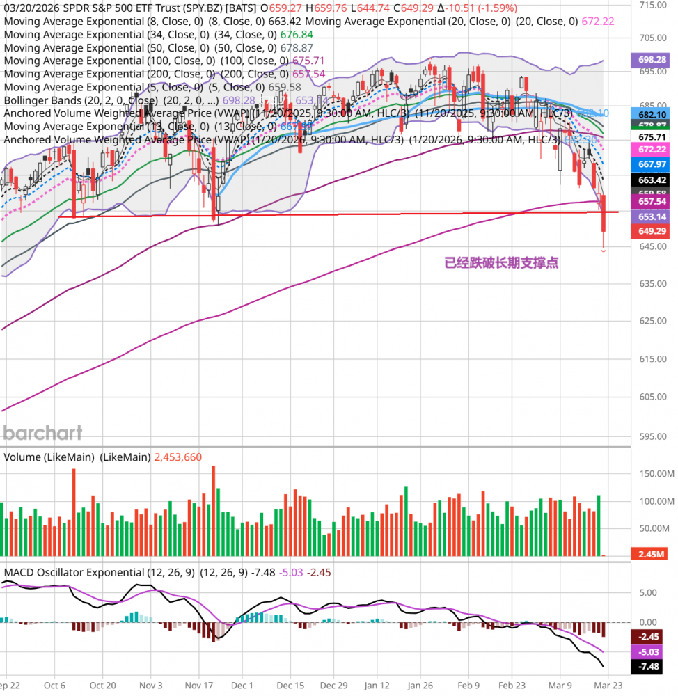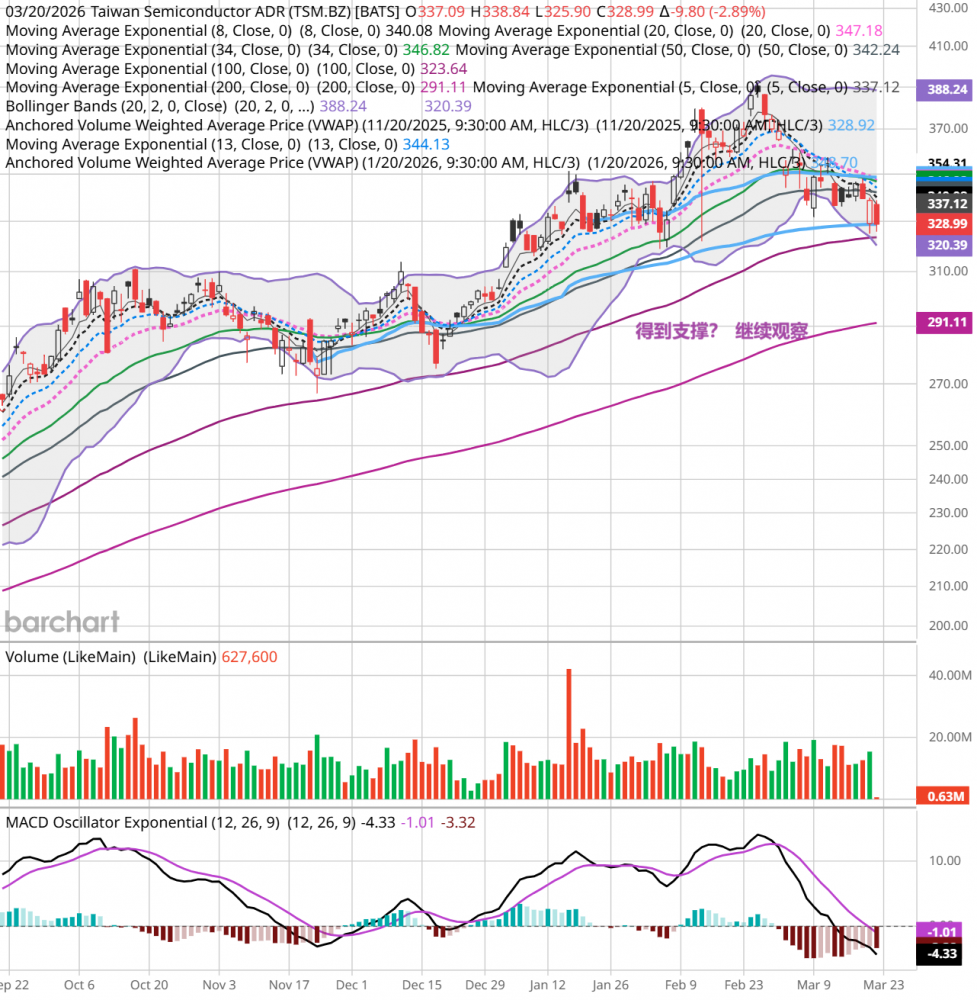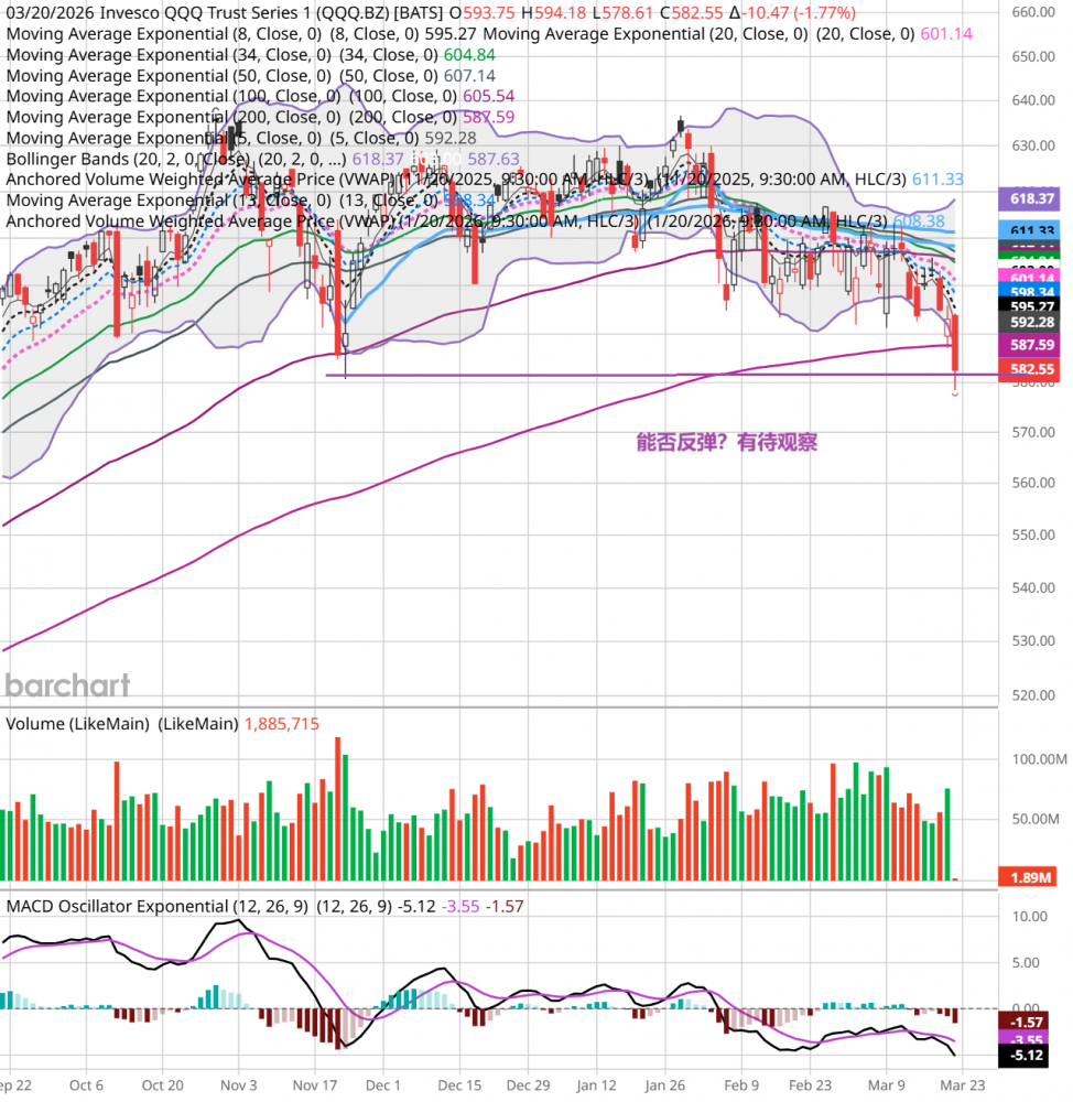 周五,中东冲突继续,油价又回升到100美元区域,大盘低开后全天单边下跌,收盘跌1.43%,跌破近期低点。qqq跌1.8%,mags跌2%,smh跌2.6%。当下空头占优势,后续走势看中东冲突的发展。 个人的操作,继续持股。个人看法,仅供参考。