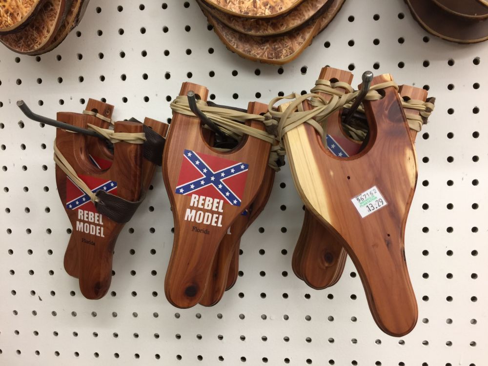 这个已经引起全国争议的支持奴隶制的七州邦联旗还在这儿大摇大摆地印在弹弓上兜售着。