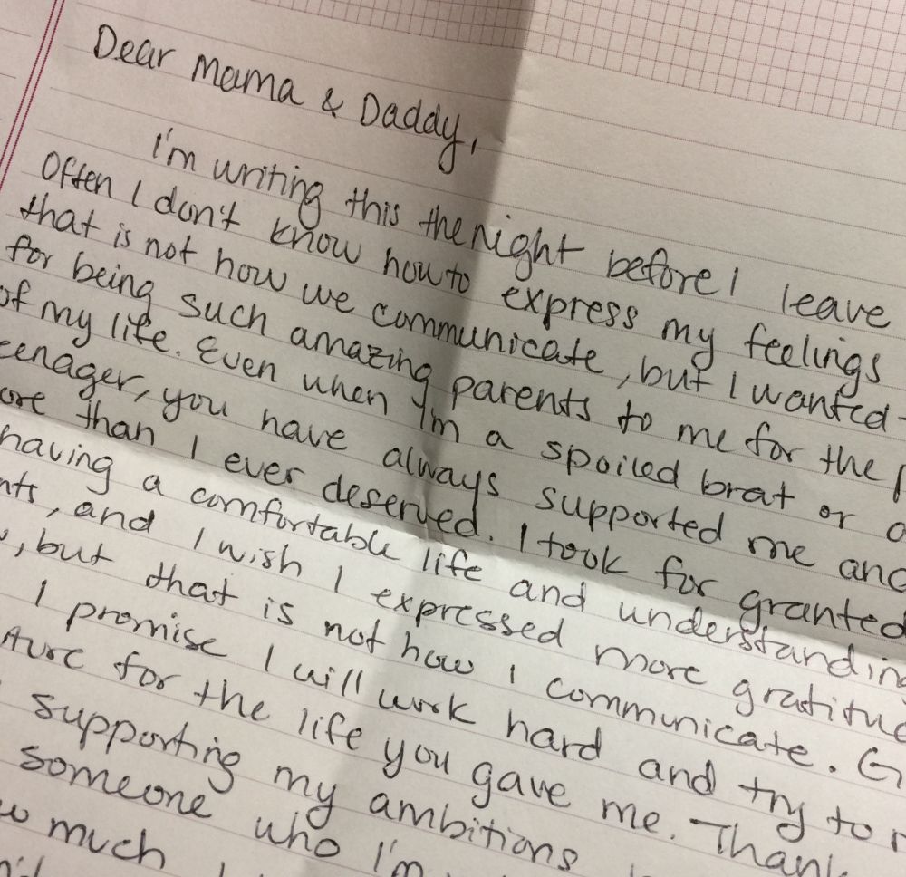 I’m writing this the night before I leave for ... Often I don't know how to express my feelings to you because that is not how we communicate, but I wanted to thank you for being such amazing parents to me for the past 18 years of my life. Even when I’m a spoiled brat or a moody teenager, you have always supported me and given me more than I ever deserved. I took for granted the privilege of having a comfortable life and understanding, loving parents, and I wish I expressed more gratitude verbally to you, but that is not how I communicate. Going into college I promise I will work hard and try to repay you in the future for the life you gave me. Thank you for not only supporting my ambitions, but never pressuring me to be someone who I’m not. It’s hard to put into words how much I love this family and I feel bad that I haven’t expressed it enough while being home. I’m excited for ... and his journey in ... Even though I’m harsh on him, it’s because I don't want him to have a hard life. I hate when he plays video games and has bad manners. I don't want him to develop that materialistic mindset that I sometimes have.