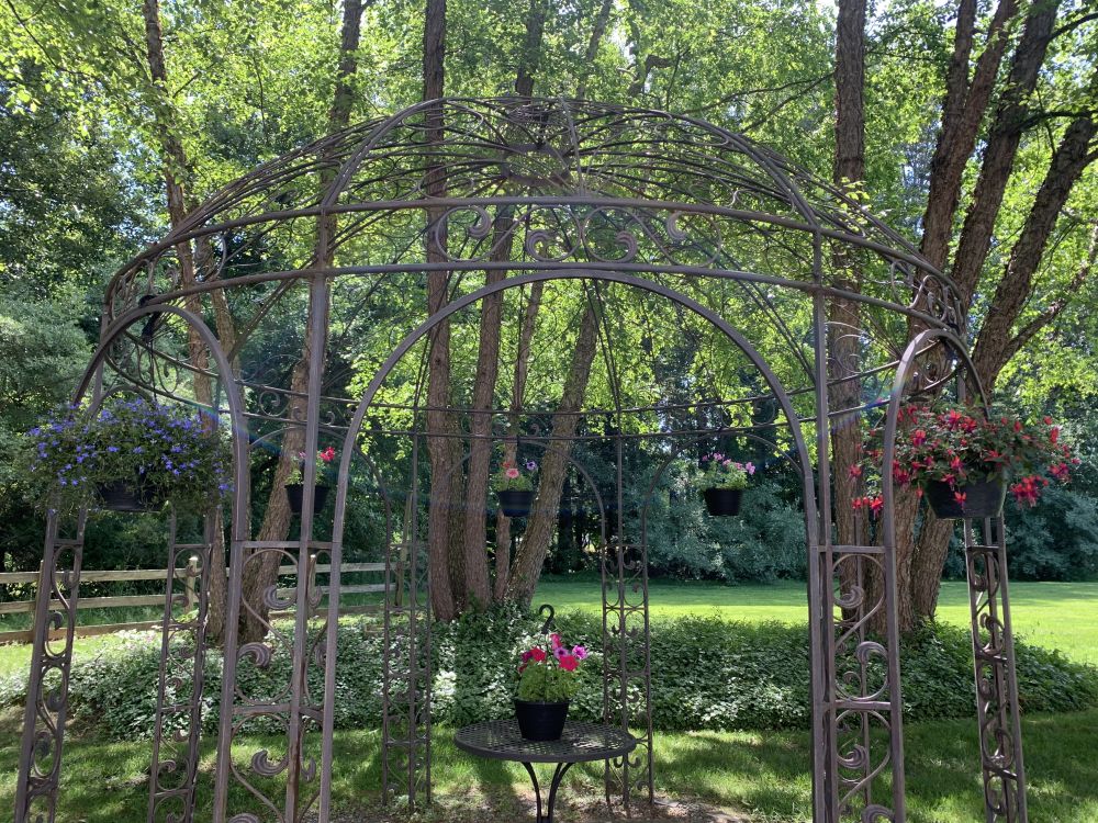 这个充满铁锈的凉亭,跟树干一样的颜色, 虽然不显突兀, 但我和老公不约而同地想到种植些绿藤植物,尽量覆盖住铁框架, 让它与环境浑然一体, 但是什么样的绿藤不会被鹿吃,到现在还没有找到。 很多标签上写着鹿不吃的, 最后鹿照样吃。 这挺烧脑的。