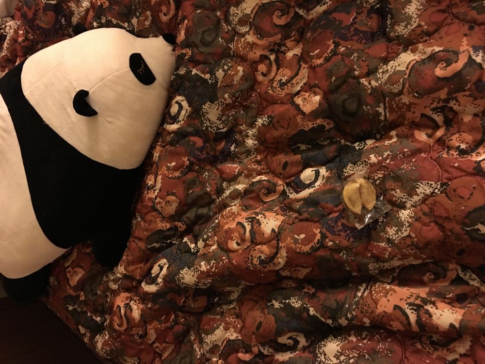第二天一早,麻麻在床上发现了花大宝的礼物,一个fortune cookie,花大宝最喜欢玩哗啦响的东西,喜欢的东西都要藏到麻麻床上。另外这个超级柔软的大熊猫本来是麻麻的抱枕,花大宝特别喜欢,一碰到就踩奶,所以就给她了。