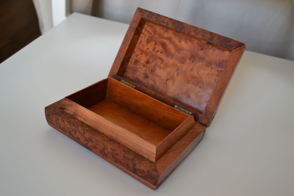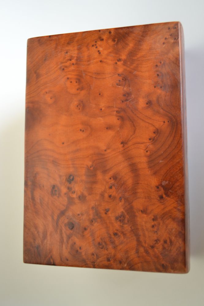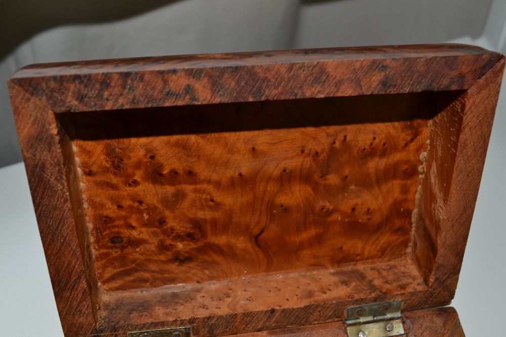 摩洛哥所产的瘿子木,“火焰纹”和“鬼脸纹”很亮丽,可能是因为木质中含有丰富的油脂,从而产生折射光。而且,木质中有明显的略显透明状的小结晶点、类同松香,这是香味浓烈而持久多年的原因。估计此种工艺品在北美有市场,我曾在多伦多的圣劳伦斯周日古董集市上,多次看到有售,大多是大小不一的瘿子木工艺首饰盒。