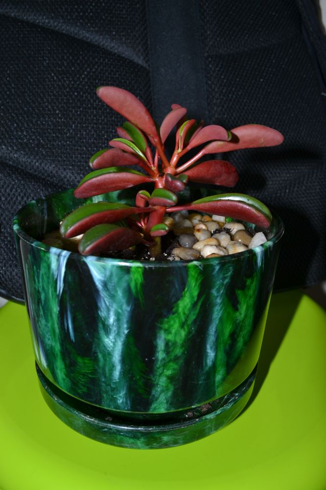 是三周前引进的。那天路过一家花店,看到有一小盆以前从未见过的植物,长着正面暗绿、背面暗红的肉质叶(没有标品种名称),色彩对比鲜明,好奇之下就买了回来。后来到其它花店,都没见到有售。那家花店原有的三盆小苗,卖完后也没有再进货。可见这个品种现在还未流行。