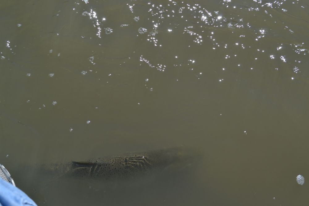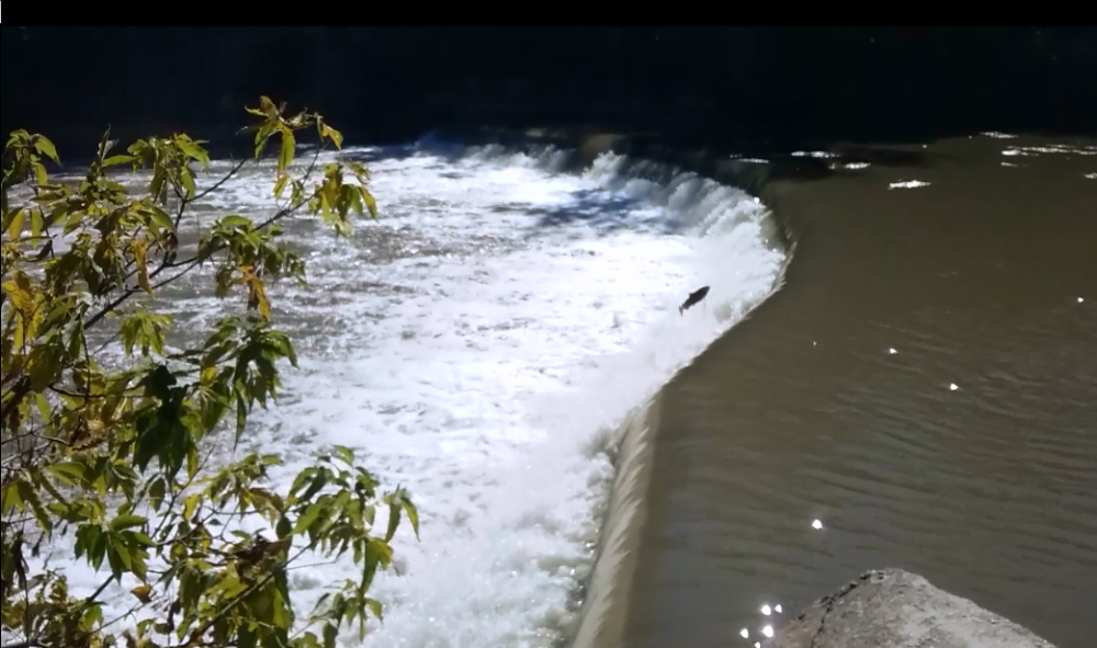 这一段水面下已积聚了大批从安大略湖中游来的三文鱼。我选了一处、坐在河堤上、双腿垂挂在离河面约一米的水流上方,脚底下即不断有三文鱼游过。大多数三文鱼身长近一米,身体外表呈淡灰褐色、布满黑斑。如此近距离看三文鱼真是有趣,她们溯流而上很是艰难,约十分钟左右才能逆行数米,有时是进二步退二步。