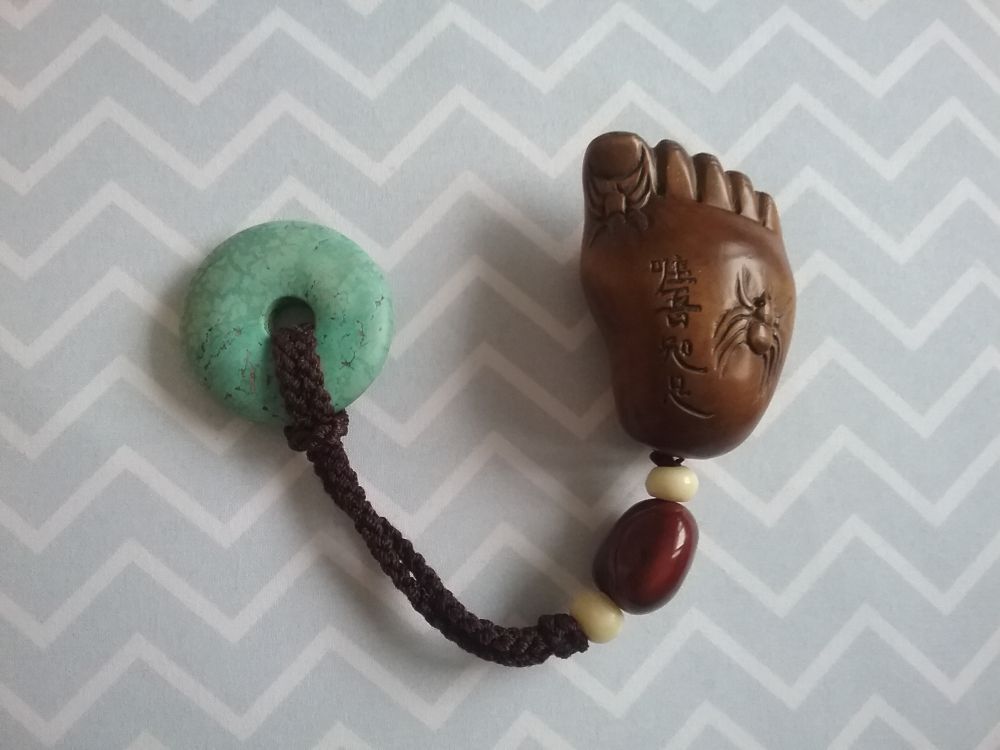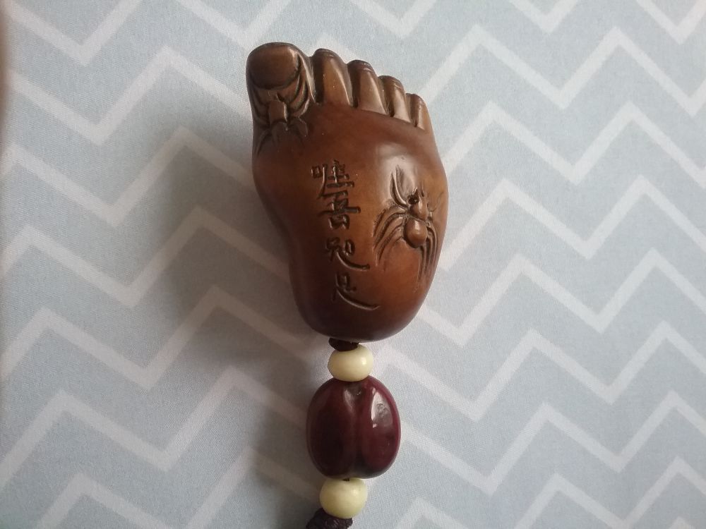 主件是木雕的婴儿脚(足),胖拙可爱。在大脚趾处和脚背分别雕了两只蜘蛛,图案寓意乃为:蜘足,知足。又锦上添花地刻上唯吾知足四字、刀法老到'',我觉得这句古汉语选得也好,不管外部环境怎么不顺利,能够过得去就成,所谓任尔严冬酷暑"唯吾知足"也!上网一查,此语来自汉唐时期一枚花钱,四字都借用铜钱中间一个口字,来历不凡。