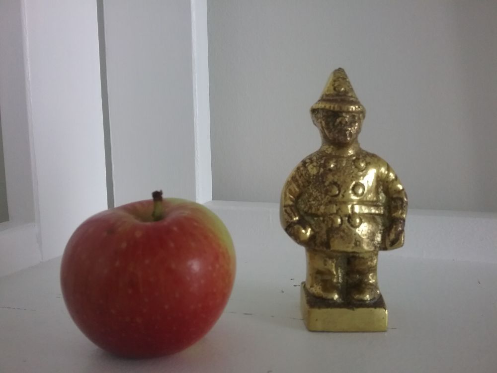铜器仍然很小,高约10公分,警察这件作品,可能翻砂浇模不大成功,脸上尽是麻子,也无法修饰。是英国皇家骑警模样,大概平时贪吃贪喝,成了一个胖子,在街面上巡逻,遇有需要身手敏捷之处,不免吃力。