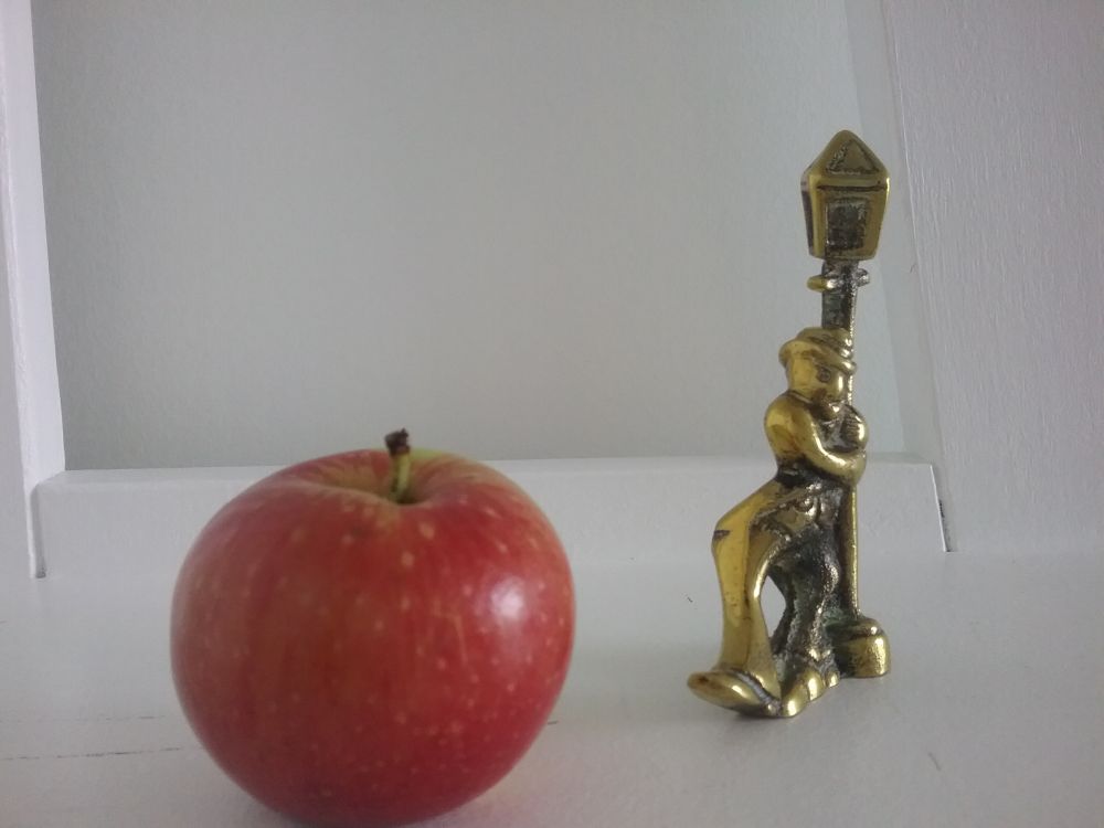我将这两个分别从不同地点、不同时间淘来的小铜人放一道,就可以想像出一个警察与醉汉的故事,那数百上千年历史的石板路,那或明或暗的排排街灯'',那已关上店门的小酒馆及里面疲备不堪的店员,都一一进入到我的梦幻中来。