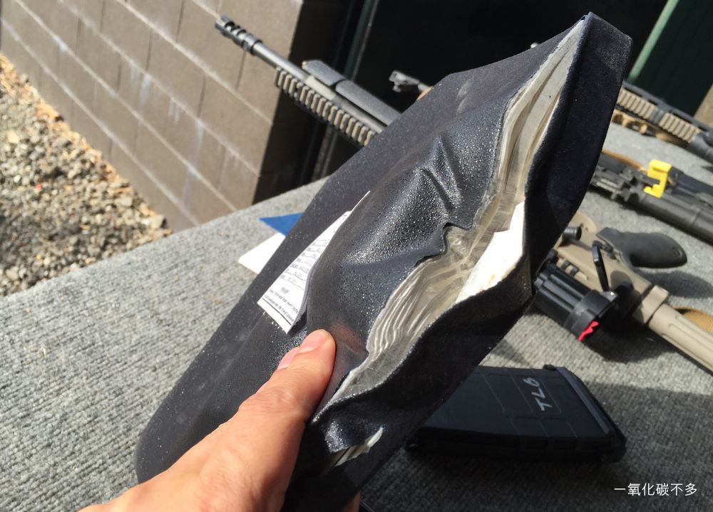 步枪子弹击中后的变形。变形的防弹衣虽然不会造成失血性危险,但是断几根肋骨还是有可能的,所以美国NIJ防弹衣测试标准,除了穿透测试还用泥膠检测变形,变形超过规定就不及格。