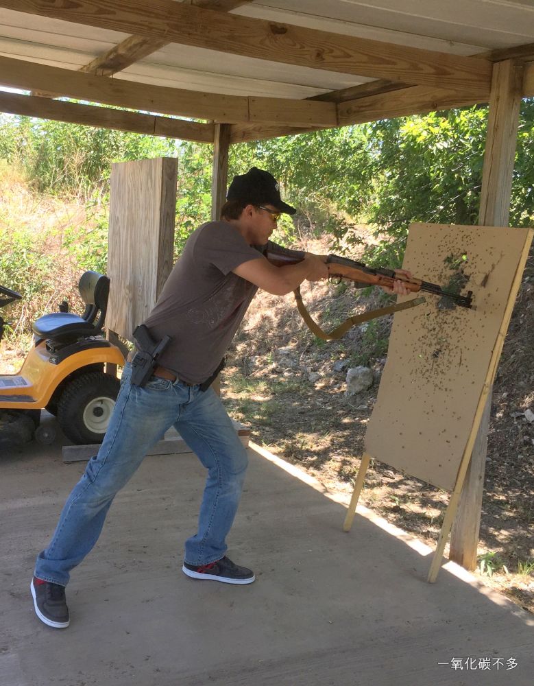 这是AK系列的战术射击练习。实用射击里俄国AK系列和美军M4系列的战术动作是有一定分别的,比如说AK弹匣的长度就限制了部分M4动作的使用,替换弹匣的动作也不一样。AK在手,美式的动作立马换成了俄式的动作。由于AK和M4在北美是最流行的长枪,作为室外自卫防身,学习这两种枪的使用是很有必要的。
