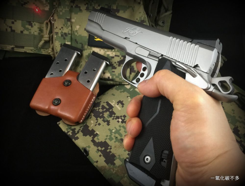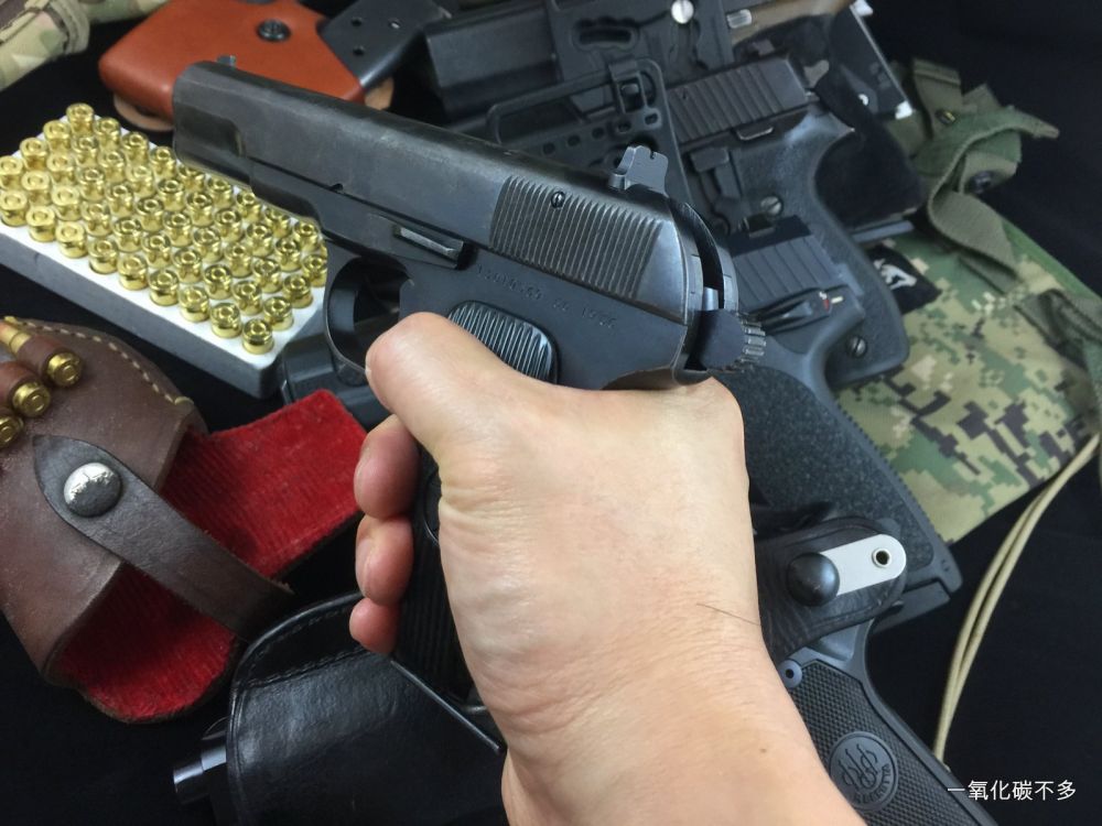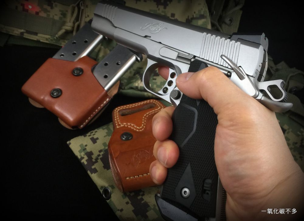 图 2: 1911 C1,子弹上膛,击槌扳起,保险杆处于安全状态,掏枪后开保险就可以射击。美国老一辈的海军陆战队退役队员都喜欢这样携带。
