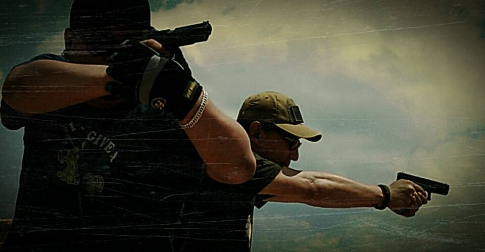 图 13: 改良韦夫推拉式持枪法,到了今天依然不能算落伍,这是我们早年练习的照片,前面那位采用的就是改良韦夫推拉式持枪法