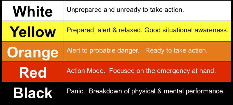2.黄色:精神上放松,但是保持警惕,你充分了解到这个世界上没有绝对安全的地方,你随时准备出手保卫自己。当你身处不熟悉的地方或者被不熟悉的人包围的时候,精神上最好保持黄色警戒。当你处于这个状态的时候,你必须对周围的环境和人物保持一定的观察。当然,你没有必要紧张,只是向雷达扫描一样在一定时间里多留意一下身边的事务而已,其实这没什么特别,不过是一般八卦点的师奶都经常会做的事情。还有就是你如果身上携带武器,那么精神上就必须处于黄色警戒的状态。关于这点我非常同意,当我携带武器的时候,哪怕是在最热闹的人群里,我都会保持一定的警戒心。
