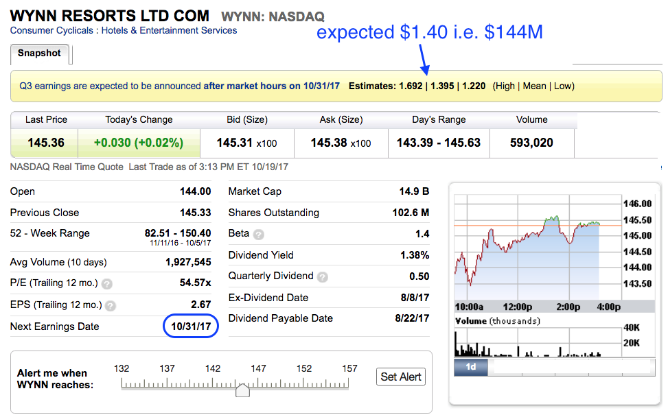 | 06/14/17 | 10:29 AM EDT | Sell 1 WYNN Jun 16 '17 $120 Call Executed @ $14.8 |
