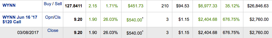 | 06/13/17 | 11:05 AM EDT | Sell 2 WYNN Jun 16 '17 $120 Call Executed @ $13.65 |