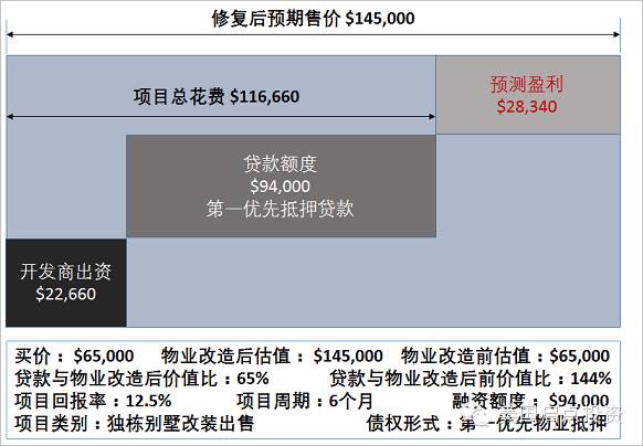 上边算数是简单活动一下大脑。下面的是关键。看几个比例,很重要。比来比去就比下去了。贷款$94,000,物业改造后售价$145,000。这个比例是64.8%。学名叫LTV(Loan to Value),注意这里的V是ARV (After Repair Value)。看着挺好一个比例。假设,开发商跑路了,我们有第一物业抵押,那就是说,物业归我们了,我们可以自己卖,如果卖$94,000,我们不亏本儿。现实没这么简单了!关键是物业能卖到$94,000这个价格吗?开发商什么时候跑路(假设)?刚才分析了,该物业翻修前估价$65,000,这叫As-is Value,又有个V。如果按这个V计算LTV,比例是144.6%。假设按市场价格卖了$65,000,我们投资亏损$29,000。虽然不至于像股票可能血本无归,这种亏本买卖也不能做。当然,启点投资有自己有拍档施工队伍做后继,不怕他跑路。如果让开发商去做,启点必须严格控制金融构架。