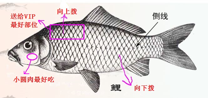 那该怎么吃呢?其实不难,鱼侧线上面部分的肉,从侧线向上拨。鱼侧线下面部分的肉,从侧线向下拨。请看下图: