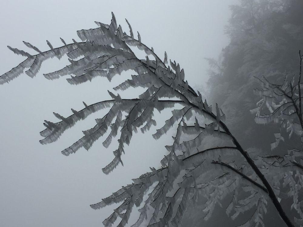大峡谷景区分为云龙地缝景区和七星寨景区两部分,由于时间有限,我们决定不去看地缝 - 顾名思义,不就是一条很深的石沟吗?七星寨才是看景看峰的。这个时候是旅游淡季,游人非常少,加上其他人都先去看地缝了,我们坐缆车上山时基本没有其他游客。以前看到的景点照片都是人山人海,这会儿人少得感觉有点不真实。缆车快到山顶时我发小激动地大叫起来,她看到石壁上的树木上都是淡淡的白色,原以为山顶下雪了,近看实际上是雾凇。 雾凇非冰非雪,而是由于雾中无数零摄氏度以下而尚未凝华的水蒸气随风在树枝等物体上不断积聚冻粘的结果,表现为白色不透明的粒状结构沉积物。雾凇形成需要气温很低,而且水汽又很充分,同时能具备这两个形成雾凇的极重要而又相互矛盾的自然条件更是难得。据说雾凇在北方是常见的自然现象,但在南方还真不容易看到。朋友认为看到雾凇已经不枉此行,而我在美国生活的城市虽说不是最北边,但也是常下雪,所以我对与雪类似的景象相对没有那么激动。雾凇确实是很美,有照片为证: