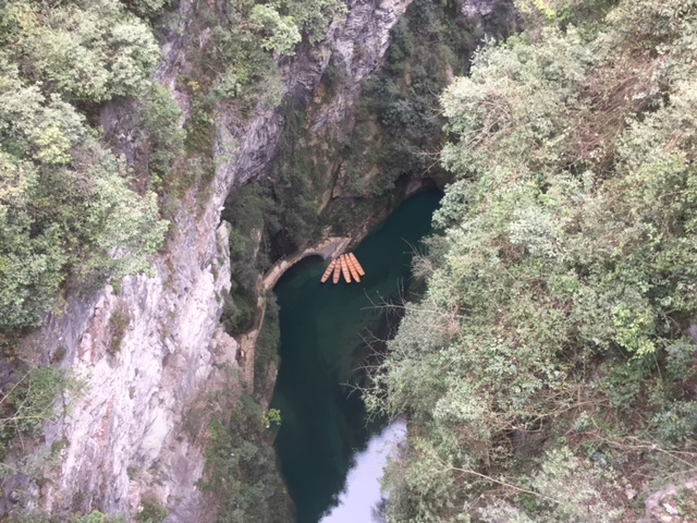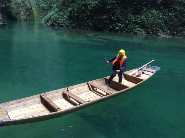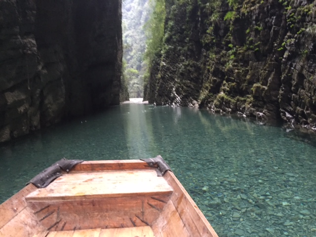 这里除县城以外当地的道路很多路段都很窄,只能过一辆车,当地老百姓都很默契礼让,彼此配合得很好,似乎道路狭窄不是一个问题。要是在城市里的话,很有可能就打起来了…… 车子沿途经过了几个黑漆漆的山洞隧道,也是只有一辆车的宽度,上面还滴着水呢。几十分钟后我们来到了船主人的家,一个很有生活气息的农家大院,木头的房子紧靠着河边,沿墙整齐的堆放了很多烧火的木材,菜园里的青菜绿油油的,几只母鸡在相互追逐,公鸡们昂首挺胸,两只狗欢快的迎了上来,最重要的,油亮亮的木船(一大一小)就停靠在静静的河边。除了我们,河面和河岸上都一个人也没有。我想世外桃源就应该是这样子的吧。