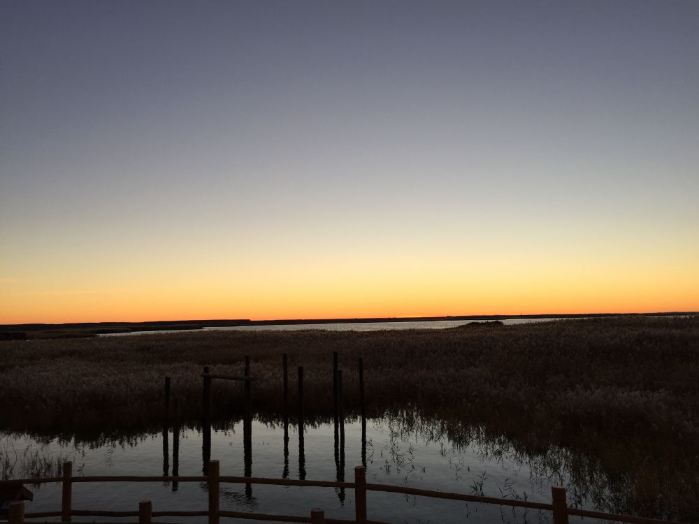 言归正传,当我们差不多开了一个小时到了看日出的湖边时,已经有很多很多早起的人们在那等待着了,不少人都是长枪短炮的看起来很像专业摄影师(我们中国人民现在真的是很有钱)。大家各自找到自己喜欢的最佳位置,在寒冷中耐心地等待。湖对面的地平线上慢慢地泛出橘红光色,朝阳一点点地往上爬着,大家的热情也随之而高涨着,激动的欢叫声此起彼伏。栖居在芦苇荡中的鸿雁随着大家的欢呼声在洒满晨光的湖面上骄傲地飞翔......