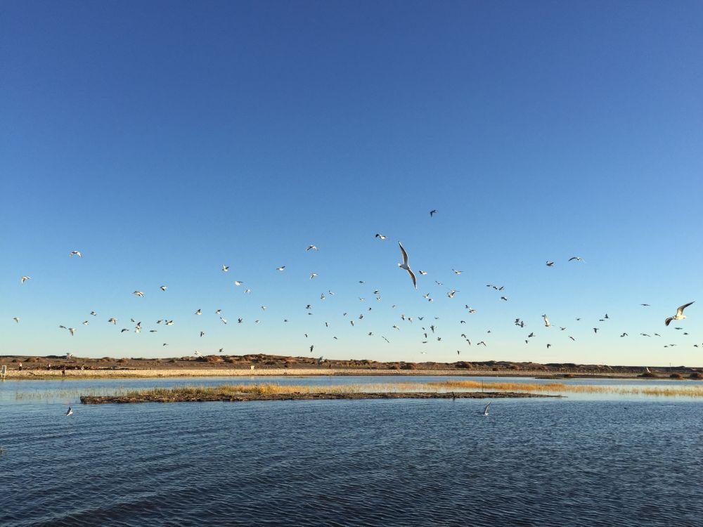沙漠中的湖泊是一颗美丽的明珠,湖面上初升的朝阳温暖着芦苇,大地,鸿雁和看日出的人们。