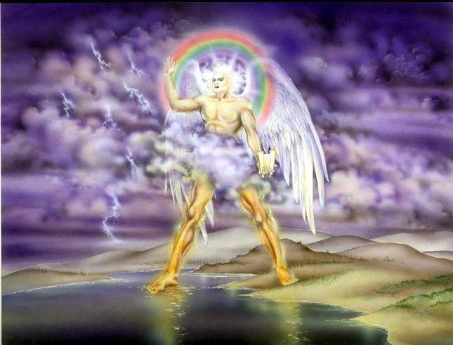 Now John "saw another mighty angel coming down from heaven". This amazing looking angel is robed in a cloud, with a rainbow above his head like a crown. His face shines like the sun, his legs are like pillars of fire. He is holding a little scroll in his hand. We don't know if this little scroll is the same scroll that only the Lamb was worthy to open or not. But we can be sure that it has God's Word on it.