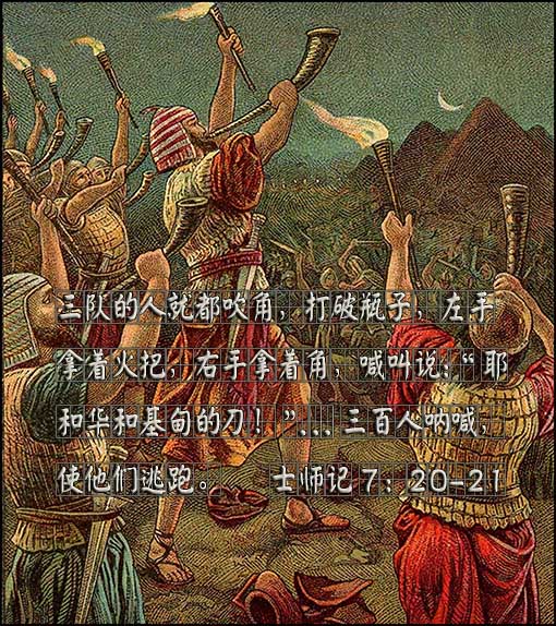 “基甸听见这梦和梦的讲解,就敬拜神”, 他是从心里完全相信神了,敬拜之情自然地由心而生。他带着仆人紧赶慢赶地从米甸13万5千人的大营,回到他只是三百个兵的小营,毫无惧怕,声音宏亮地喊话了,“起来吧!耶和华已将米甸的军队交在你们手中了。” 基甸把他的兵从梦中叫醒,“分作三队,把角和空瓶交在各人手里,瓶内都藏着火把。... 来到营旁,... 三队的人就都吹角,打破瓶子,左手拿着火把,右手拿着角,喊叫说:‘耶和华和基甸的刀!’ ... 全营的人都乱窜;三百人呐喊,使他们逃跑。... 耶和华使全营的人用刀互相击杀,... 以色列人就从...全地聚集来追赶米甸人。... 捉住了米甸人的两个首领”, 杀了后,提着首级,带到基甸那里。这场兵力极端悬殊,绝对以少胜多的仗,打得真够痛快的!