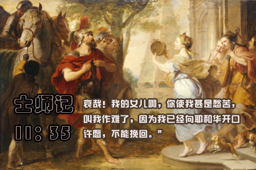 耶弗他容女儿去了两个月,“在山上为她终为处女哀哭。两月已满,她回到父亲那里,父亲就照所许的愿向她行了。女儿终身没有亲近男子。” 经文里没记载耶弗他女儿的名字,也没有具体交代她父亲“照所许的愿向她行了”的细节,我相信经文说的,耶弗他还了他许的毒愿,把女儿献上为燔祭了。这个在地上没得到完整父爱,也没得到男子爱情的女孩,在天家得到了天父的爱,她早点回天家不是悲剧吧! 神感动以色列人立了个规矩,“每年以色列的女子去为基列人耶弗他的女儿哀哭四天。” 以色列的女孩子们,不仅仅是哭耶弗他的女儿终身未嫁,她们哭的是世间真爱的罕见,是对真爱渴望而不能得到的哀伤。