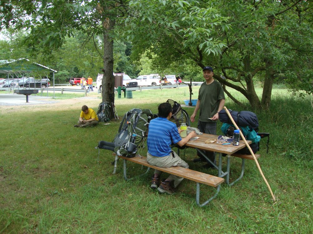 二零一六年七月九日,一大早我来到 the Proud Lake state recreation area,在过两个星期我们就要去费尔蒙了,这是我们的最后一次练习了。这里有一个庞蒂克酋长小道Chief Pondiac Trail, 我们七个人要在这里徒步旅行两天,他们六个人前一天就来了,帐篷里过了夜,我儿子有事不来了,我有事星期六才加入。我的背包里有我的帐篷,睡袋,睡垫,两天的食物和当天的水,我们的领队吉姆带着一个秤,秤了一下所有人的背包,我的包重35磅,我还带了两根登山杖。下面是我们在出发点的照片。