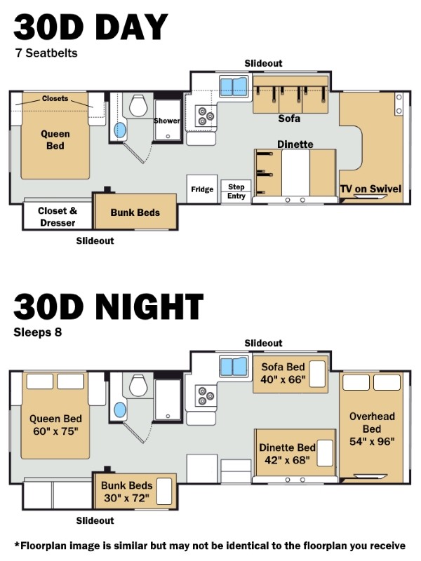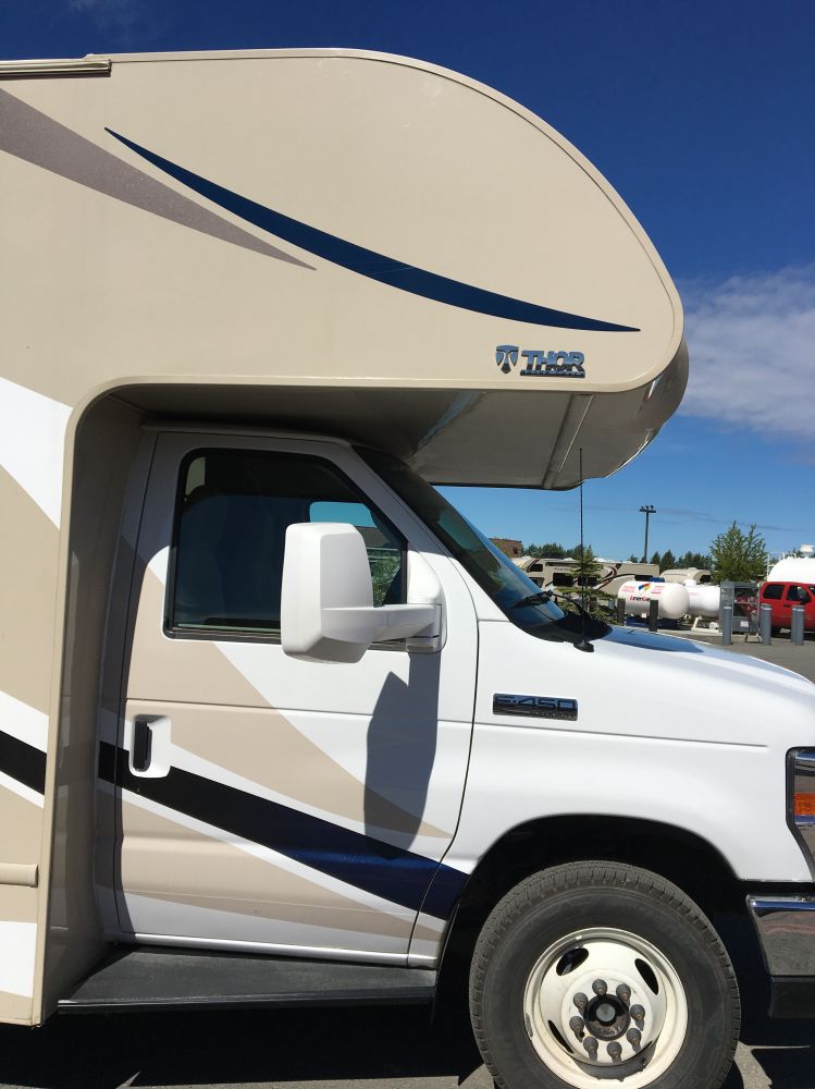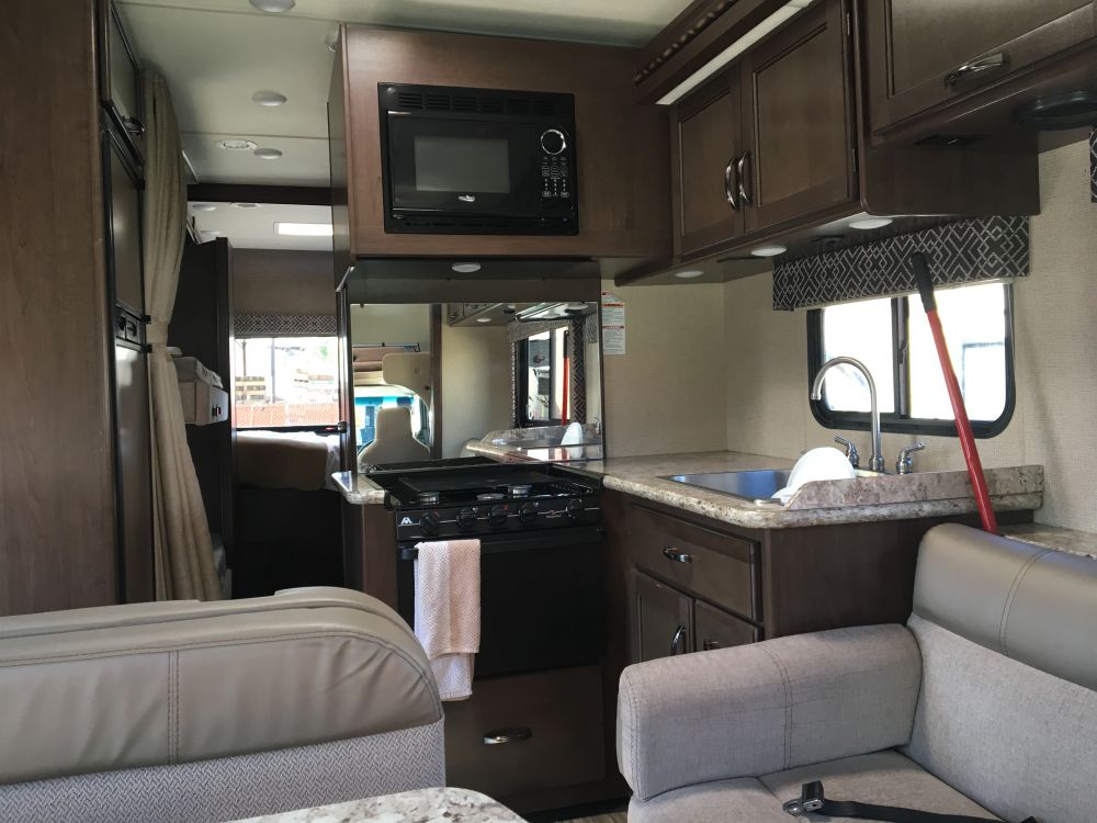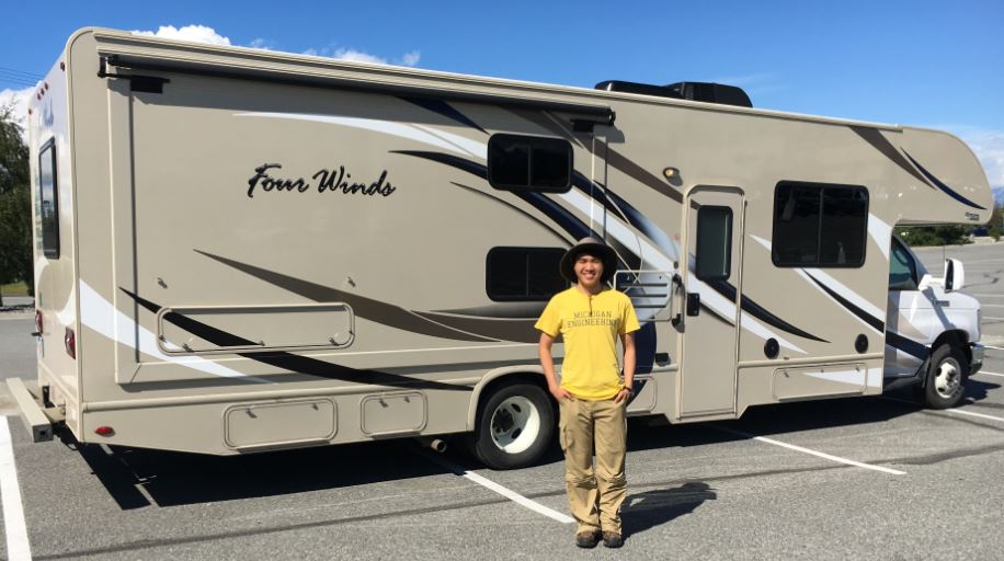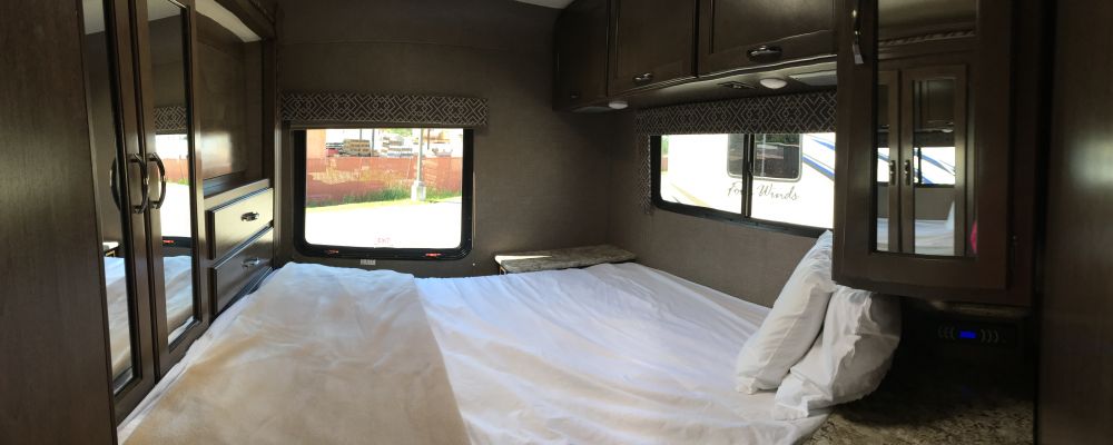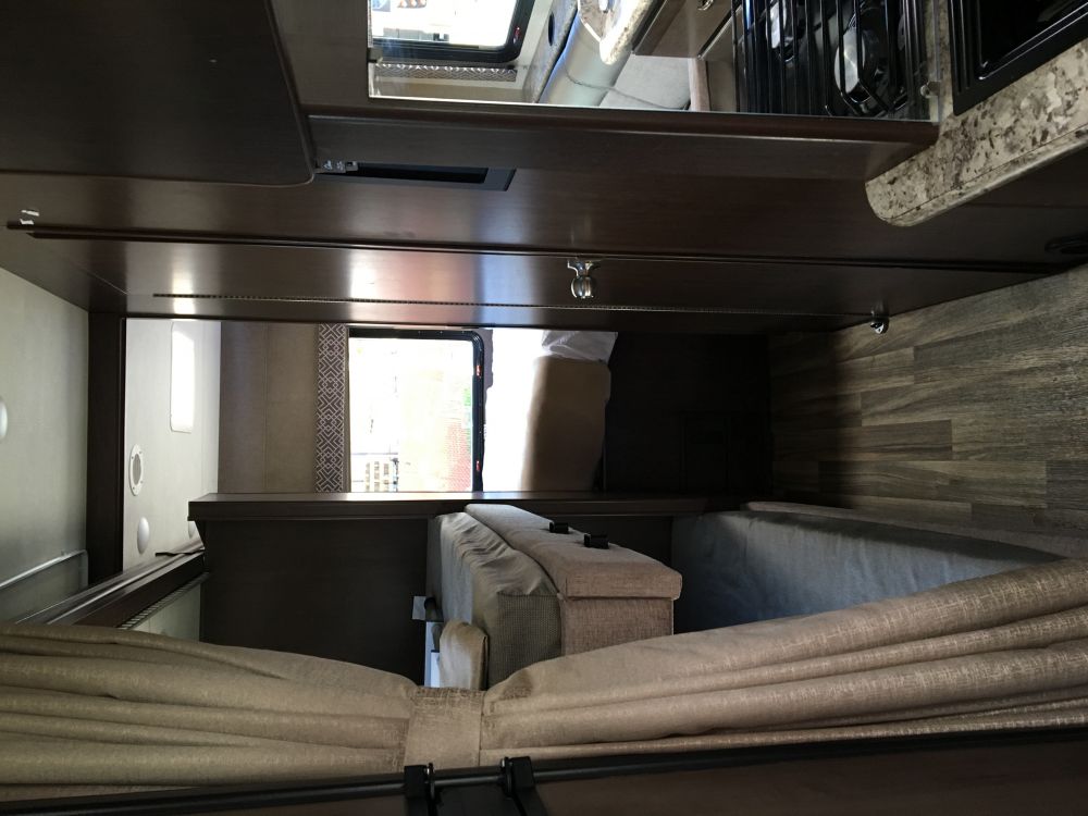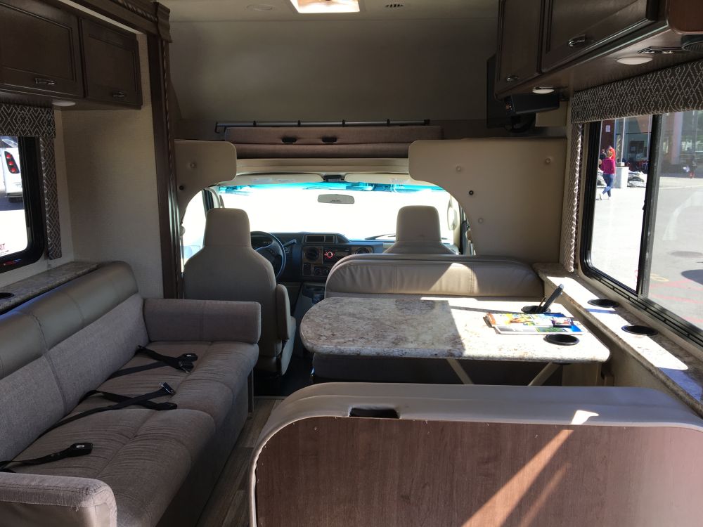 这是我们租的RV里里外外。我和太太睡车尾Queen Bed,像一个卧室一样还有门可以关上,儿子选了Bunk Beds的上铺,女儿选了车头Overhead Bed,这样晚上沙发和桌子就不用动了。