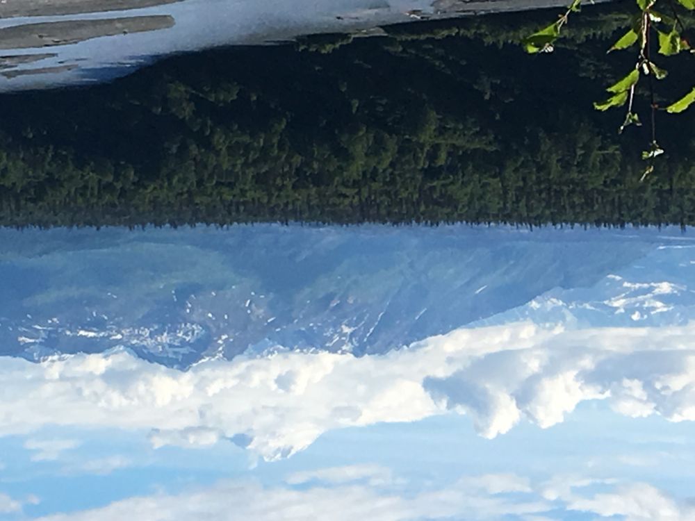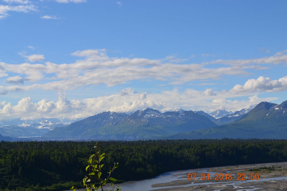 比如Milepost基本上每个英里都会有介绍,从Anchorage到Denali National Park1有237英里,我们去度假的不会一路上到处停。而免费下载的书上那段路只介绍了从Anchorage到Denali National Park19个景点,我们有时差,前一天又没有睡好,只想早点到,第一个停车点,是一个观景点Denali viewpoint south MP135.2,看迪纳利山峰,因为云多,只有三分之一的游客可以看到这个北美最高的山峰,那天也有云,但是山顶从云中露出了二个山尖。左边高的是南峰,很清楚,右边低的是北峰,只露出来一点点,我们一开始也找不到,在边上的其他游客和那里的照片标准下,大胆地往上看,终于看到了,Denali “The High One”。