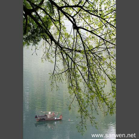 所谓烟波,是风的吹皱?是划桨的拨动?是一叶柳枝的临水无心?万千条柳枝落下,心思种种;波鳞里,氤氲里,有锦鲤一跃,人的内心,只是这一点两点的牵动。小时就喜欢春柳夏绿,喜欢在夕阳中寻看那一叶孤舟;听高枝的画眉,观远山依然而至而去的浮云,迷木舟里着衣朴素的女子,划桨过去,一道水波如绢,水涡一样的微笑。年少时有了不一样的心境,喜欢听蝉鸣,[