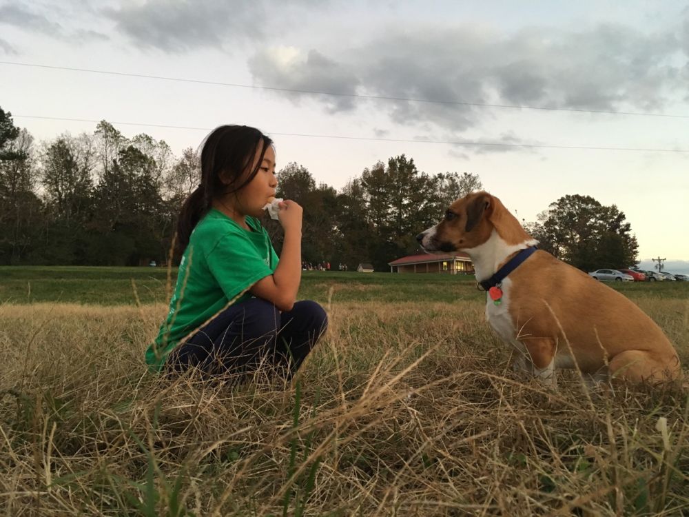 蓝天白云,傍晚喜金秋。 饭后携女,牵狗出城游。 青松挽黄叶,草绿微风柔。 冰淇淋店,长队依旧; 远望农场,谷仓伴群牛。 女食冷饮,狗舔奶油; 童年当如是,时光不停留。 夕阳余晖尚在,圆月悄悄上枝头。 老友微信打招呼, 问可想家否,叹岁月悠悠。
