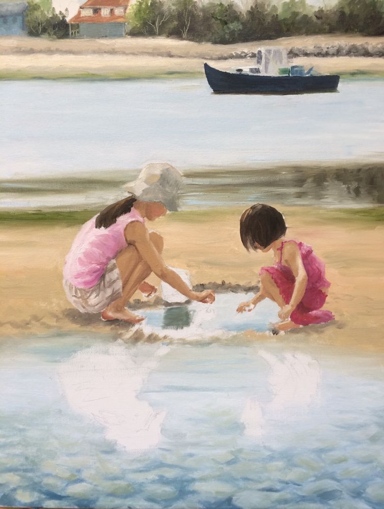 第一次画大片水面,倒影还没画。画的是自己拍的照片,构图稍微调整一下,原来人物占了大部分画面。