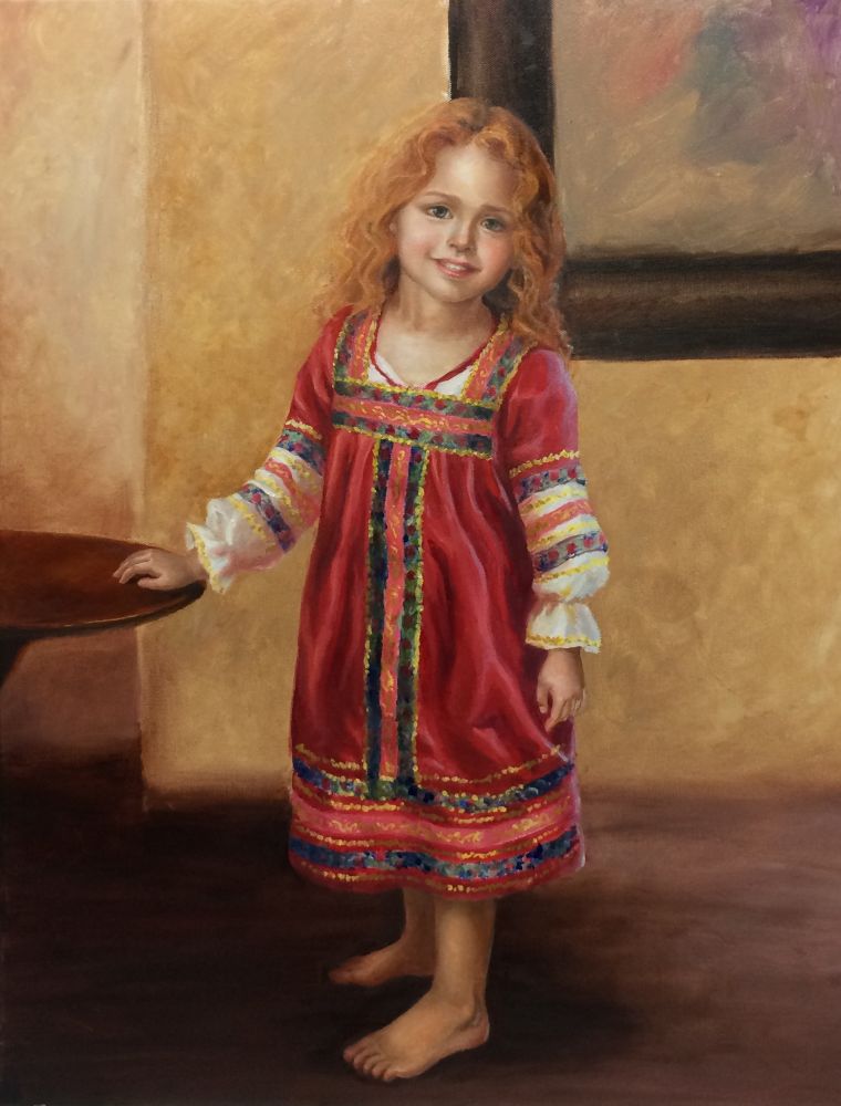 小姑娘右手本来也下垂,但填不满画幅,所以加了个小桌给她搁手,又加了个画框平衡右边(有老师指点构图)。
