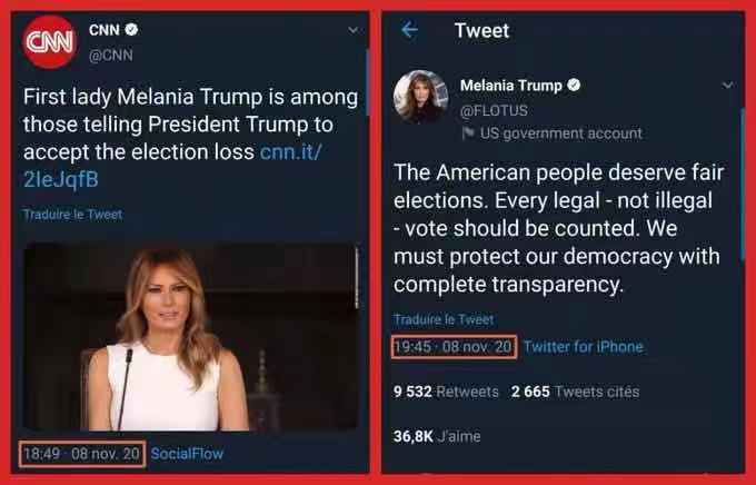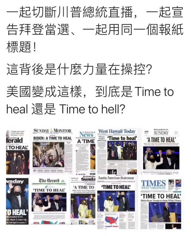 11月7日,主流媒体这些左媒,迫不及待且步调、口径、标题全都一致地宣布拜登“胜选”,很像中共的“和党中央保持一致”,甚至制造假新闻:川普女婿和第一夫人都劝他认输、川普计划参与2024年总统大选。