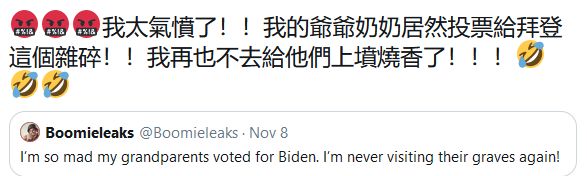 可见,台湾若没了美国的保护,难以对抗中共,蔡实在没必要跟风各国首脑猴急地祝贺拜登“胜选”,她完全没有吸取希拉里“胜选”被打脸的教训,等一下会死吗?