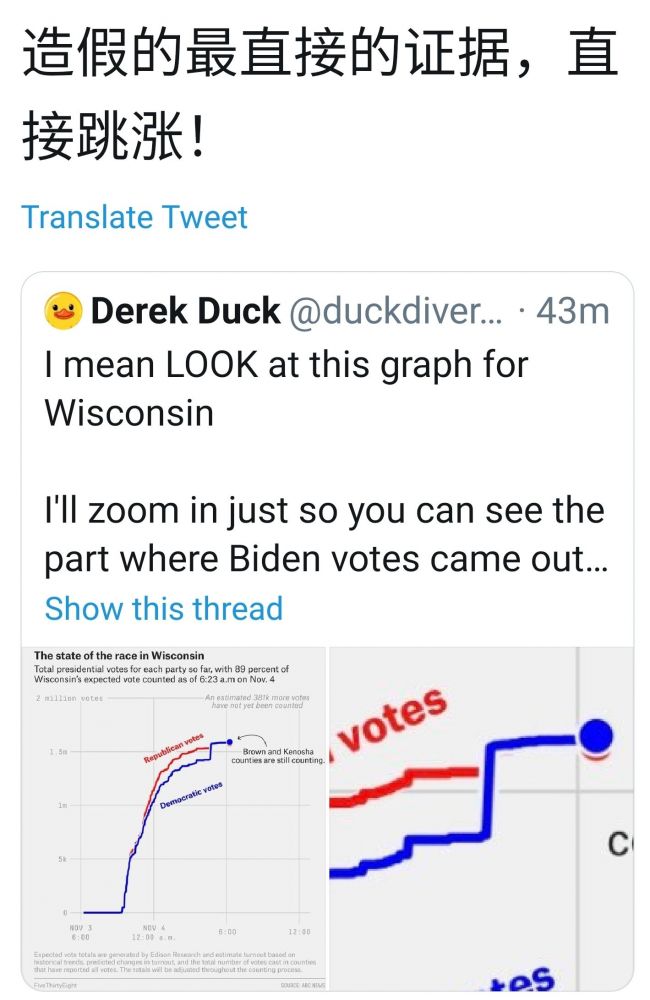 甚至,利用因疫情的邮寄投票与停止计票、延迟计票来拖延时日,以便计算造多少假票才能赢,不能像2016年那样造少而败北,使本已红的六个摇摆州同时停止计票后突然翻蓝拜登领先。