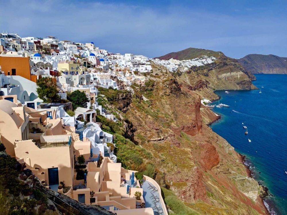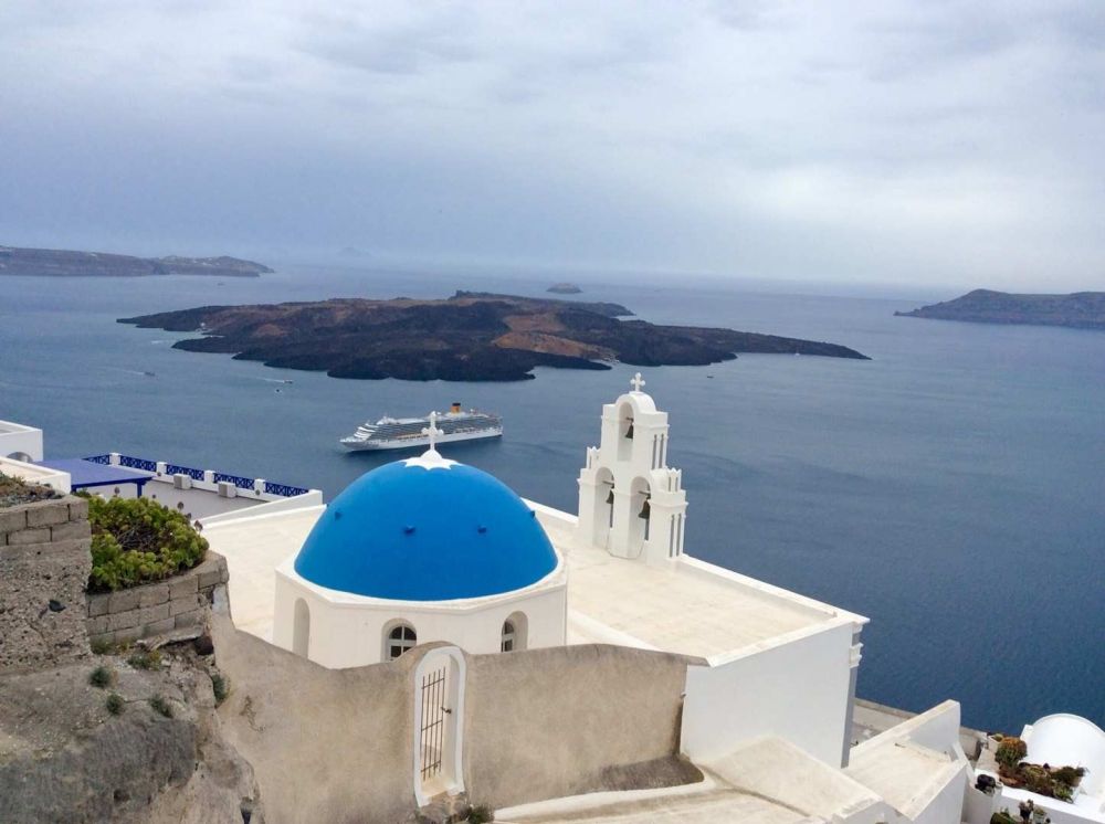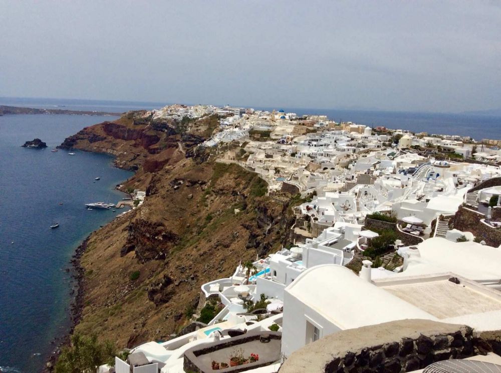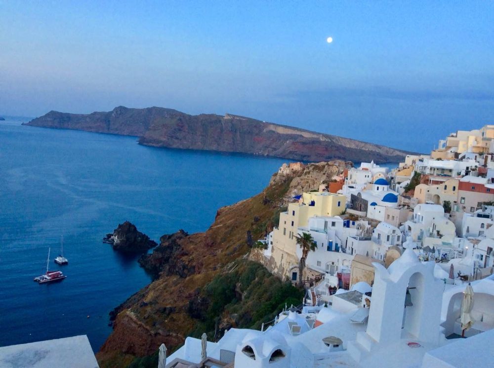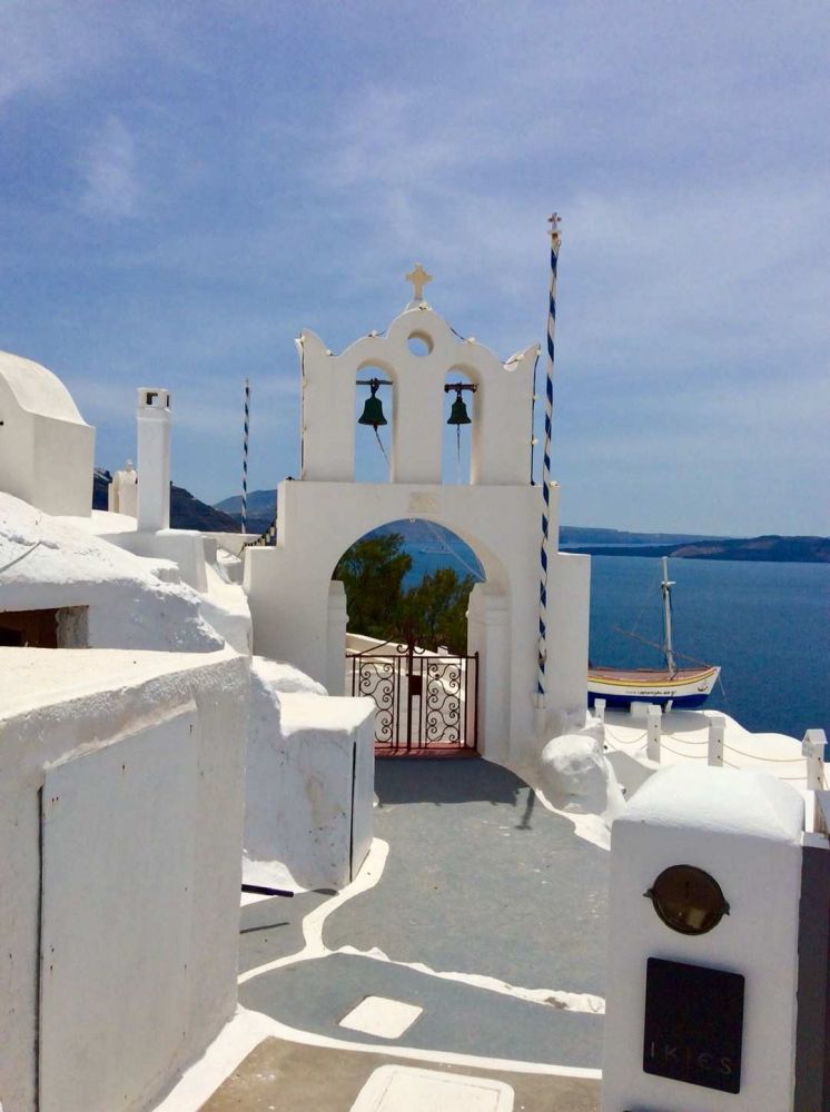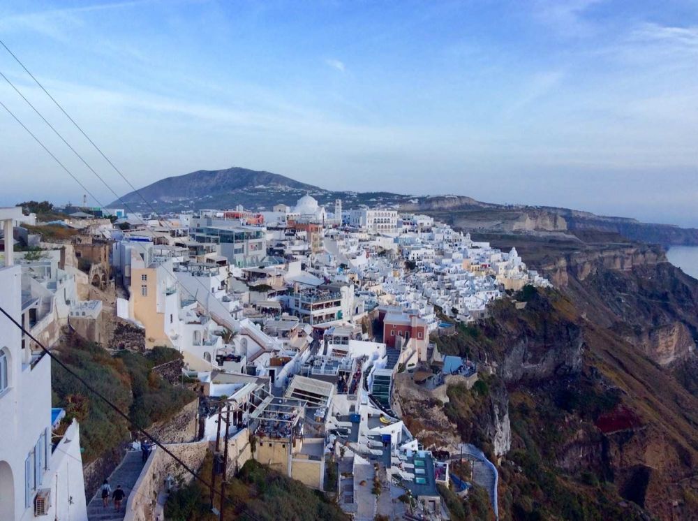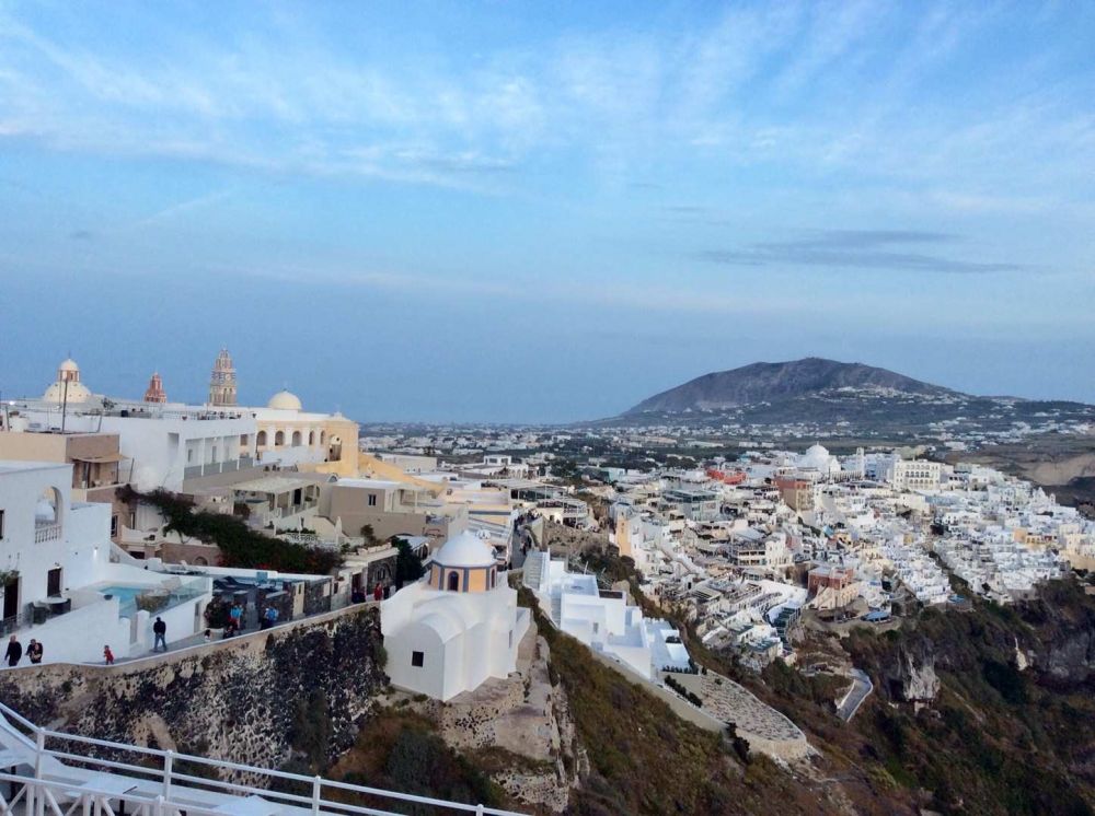 无论从Oia眺望Fira,还是从Fira回望伊亚,都有“有位佳人,在水一方”的感觉。褐红色的悬崖上,白色的房屋高低错落,层叠相连,美得圣洁;标志性的蓝顶教堂,在暖阳的照耀下,如蓝宝石般熠熠生辉。这好像是柏拉图笔下的《理想国》,让现在的我们完全沉醉其中。