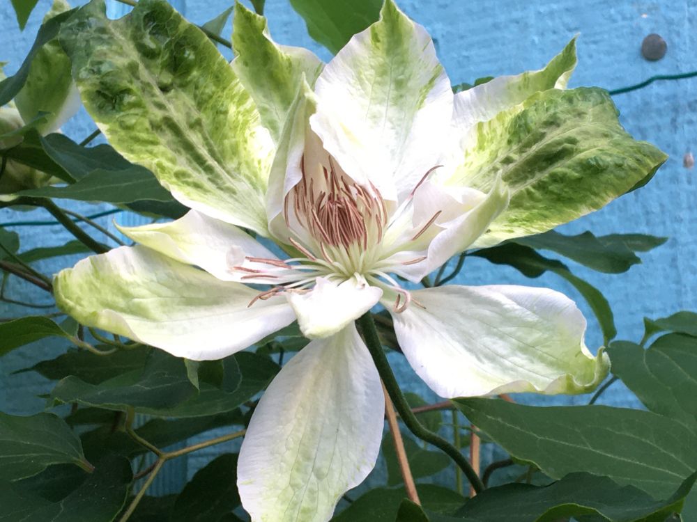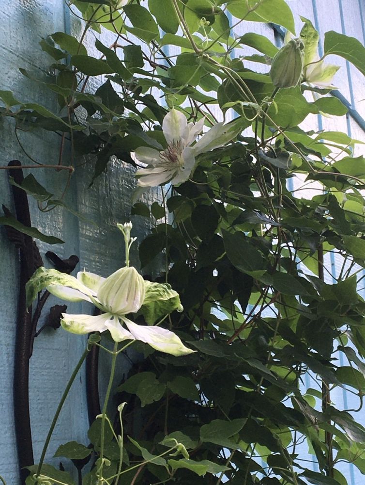 院子里种有几棵铁线莲,其中有一棵白色的Henryi, 有一棵紫色的小紫。去年专门写博文描写它们爬藤的艰辛 “我家也爬藤成功”(https://blog.wenxuecity.com/myblog/72200/201908/24347.html)。