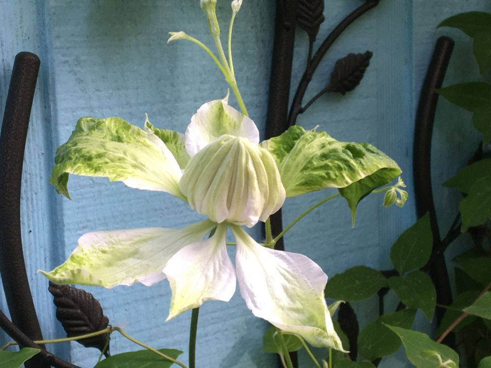 六月的时侯,Henryi 结的花苞有些奇怪,渐渐松弛的花苞,边缘上的花瓣有绿色叶子的意思。终于打开的花朵,不是去年的白色,青青的边缘渐渐在中心变白色。经过一年的“藤校”教育,Henryi 居然想改变自己花的颜色,也想改变自己花的形态,也许它以为融入一片片绿叶中是政治很正确的想法。