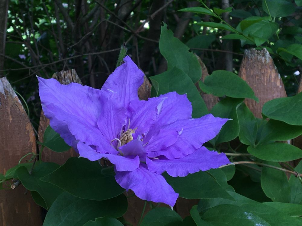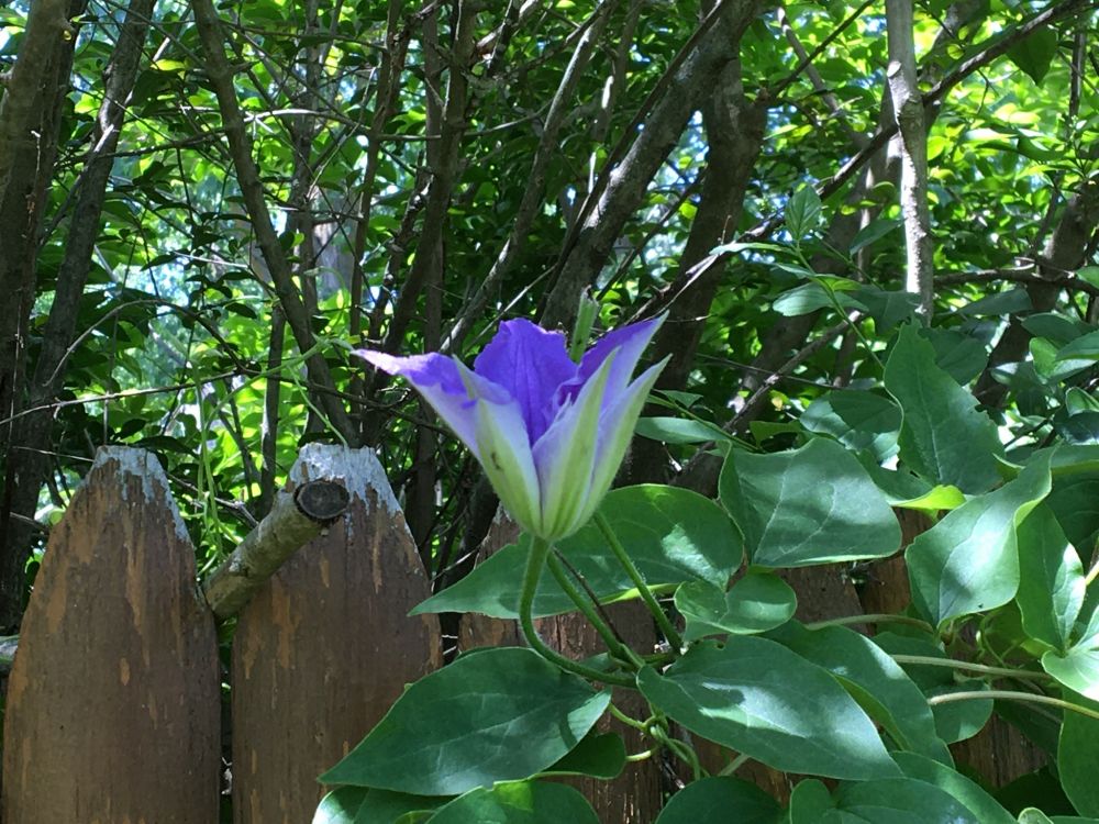 而小紫,经过四年的爬藤努力,今年终于结出三个花苞,高高在栅栏顶上。临开花前,有两个花苞被小动物吃掉,想是松鼠立在栏杆顶上顺脚牵花了。这几年每每遭遇各种挫折,身残志坚的小紫,挺着赢弱小身板终于开花,开花上了社区大学,仅有的一朵紫色的花有着坚毅的神色。