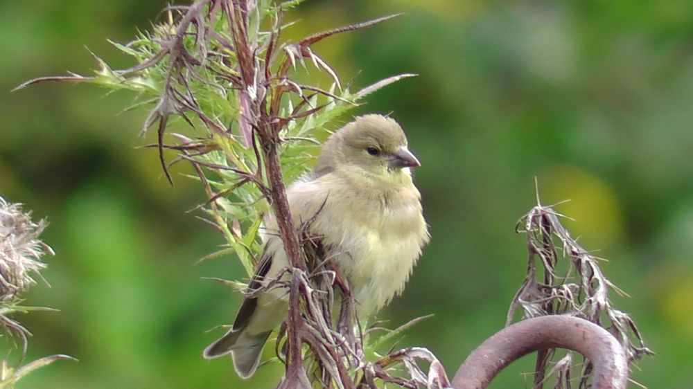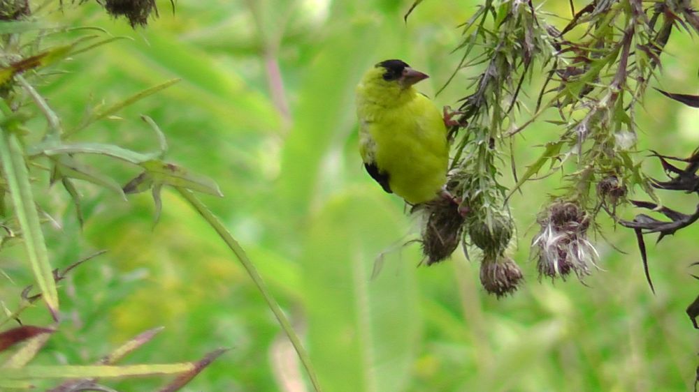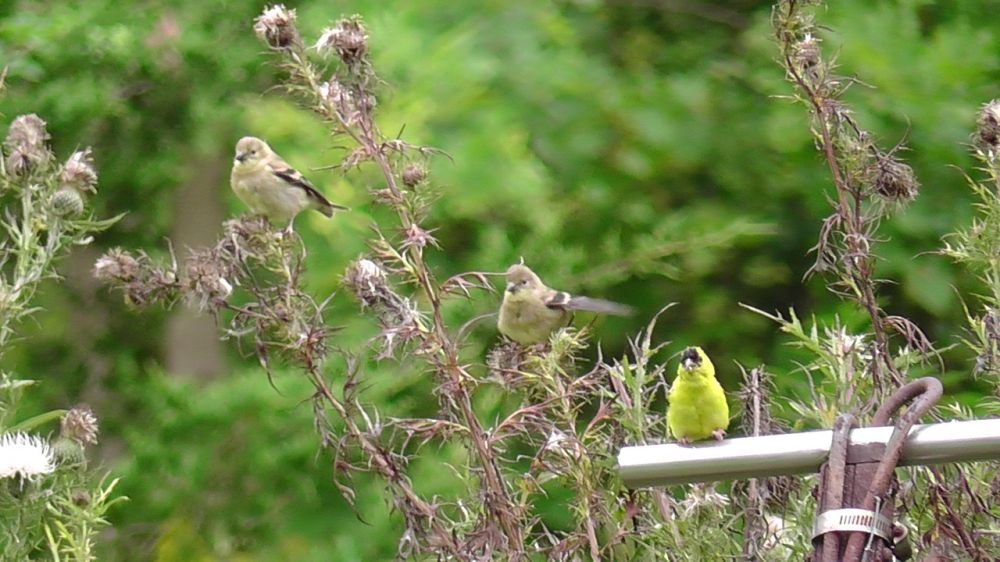 American goldfinch 鸟(美国金翅雀)穿着太阳颜色的黄衫,常常快乐的tweet tweet 叫着,倏倏地从草丛飞到树上。每年夏末秋初高高的thistle (蓟)草结籽时,它们常常踩高跷似的在thistles枝上捡草籽吃。我也专门给这些鸟留下一些蓟草,任草在院里张扬,并将它们改名为tweet tweet草。