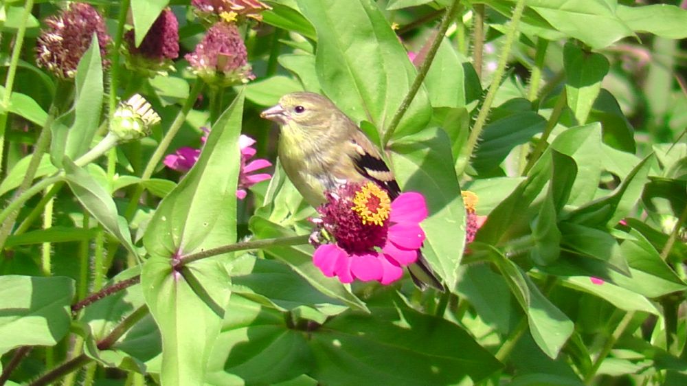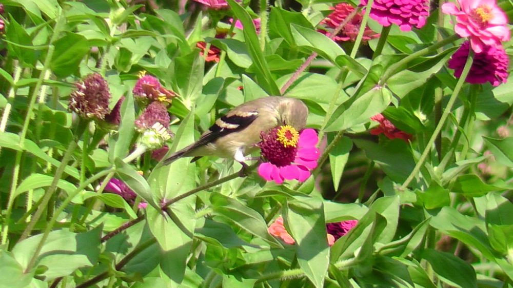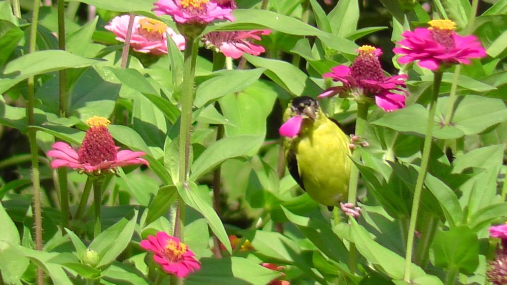去年发现American goldfinch 鸟喜欢吃我种的Zinnias花 (百日菊),它们曾飞到我窗下一小片Zinnias 丛里, 杂技演员般稳稳站在一朵Zinnia 花枝上,左晃右转扯下花朵上的花瓣,将嫩嫩的花籽吃下,将花瓣吞出。今年我扩大Zinnias 花的播种,阳台边,栅栏边种下一丛丛。八月份开始,这些Zinnias 开始展开五颜六色的花朵。蝴蝶甚至蜂鸟会在花上跓足,花丛中也开始闪现那黄色的的小身影。