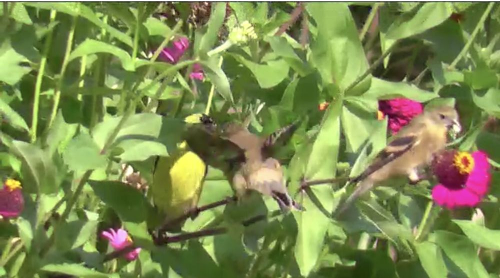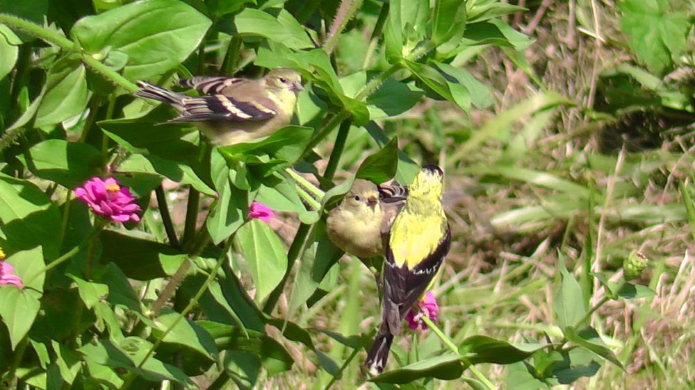 平时快乐得tweet tweet 叫的鸟爸,这个时候嘴巴不得闲,忙着采摘Zinnias 花上的幼籽,然后再一点点喂给站在花枝上猛抖翅膀高声叫饿的小小鸟们。这四、五只小小鸟,各自将花杆踩弯成大弯弓,似乎再一使劲,这支大弯弓就会将它们弹到鸟爸面前。小小鸟不停的啾啾叫声,是告诉鸟爸它们的位置,好等着无所不能的鸟爸过来将食物投入嘴里。